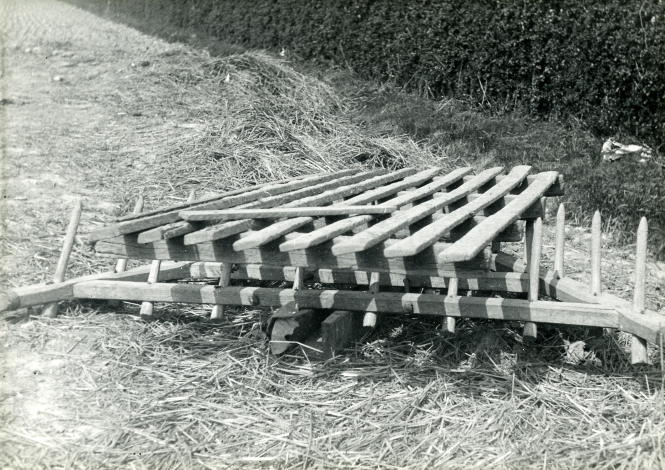 Houten sleep, rustend op een driehoekige houten eg met houten pennen, op een akker bij Berg en Terblijt.