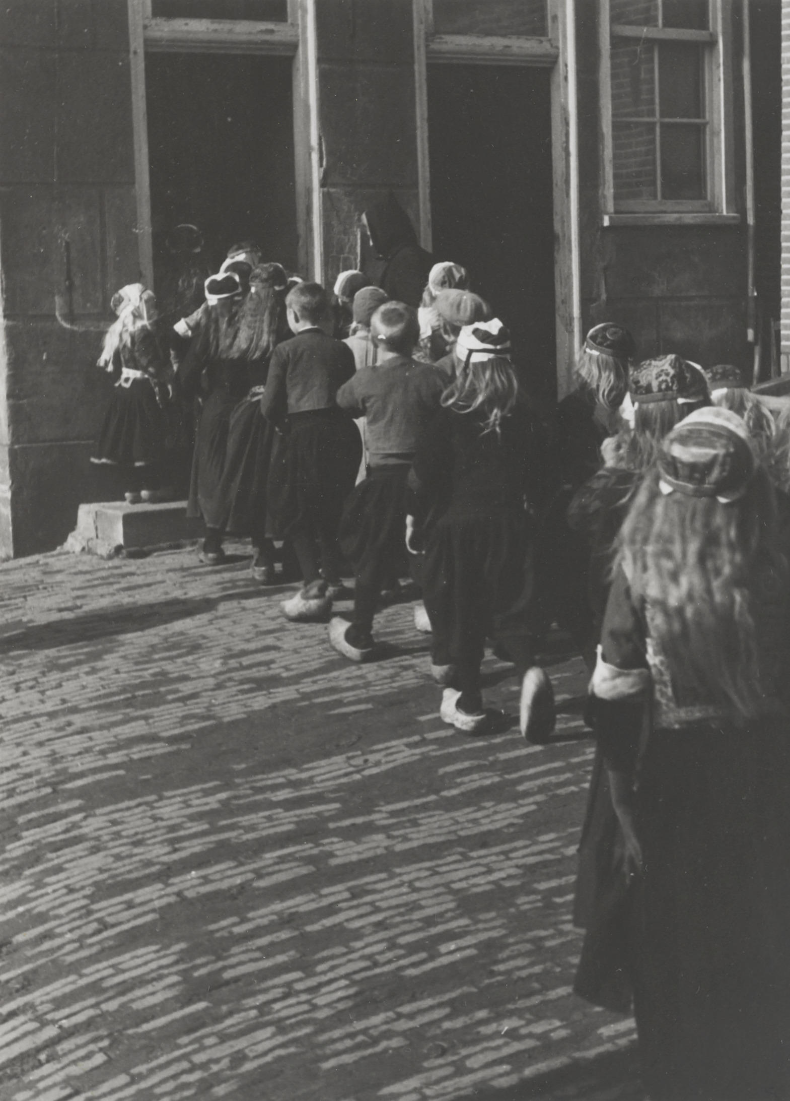 Schoolkinderen van Marken bezoeken tentoonstelling Nederlands Openluchtmuseum, 1944 (zwart-wit foto)