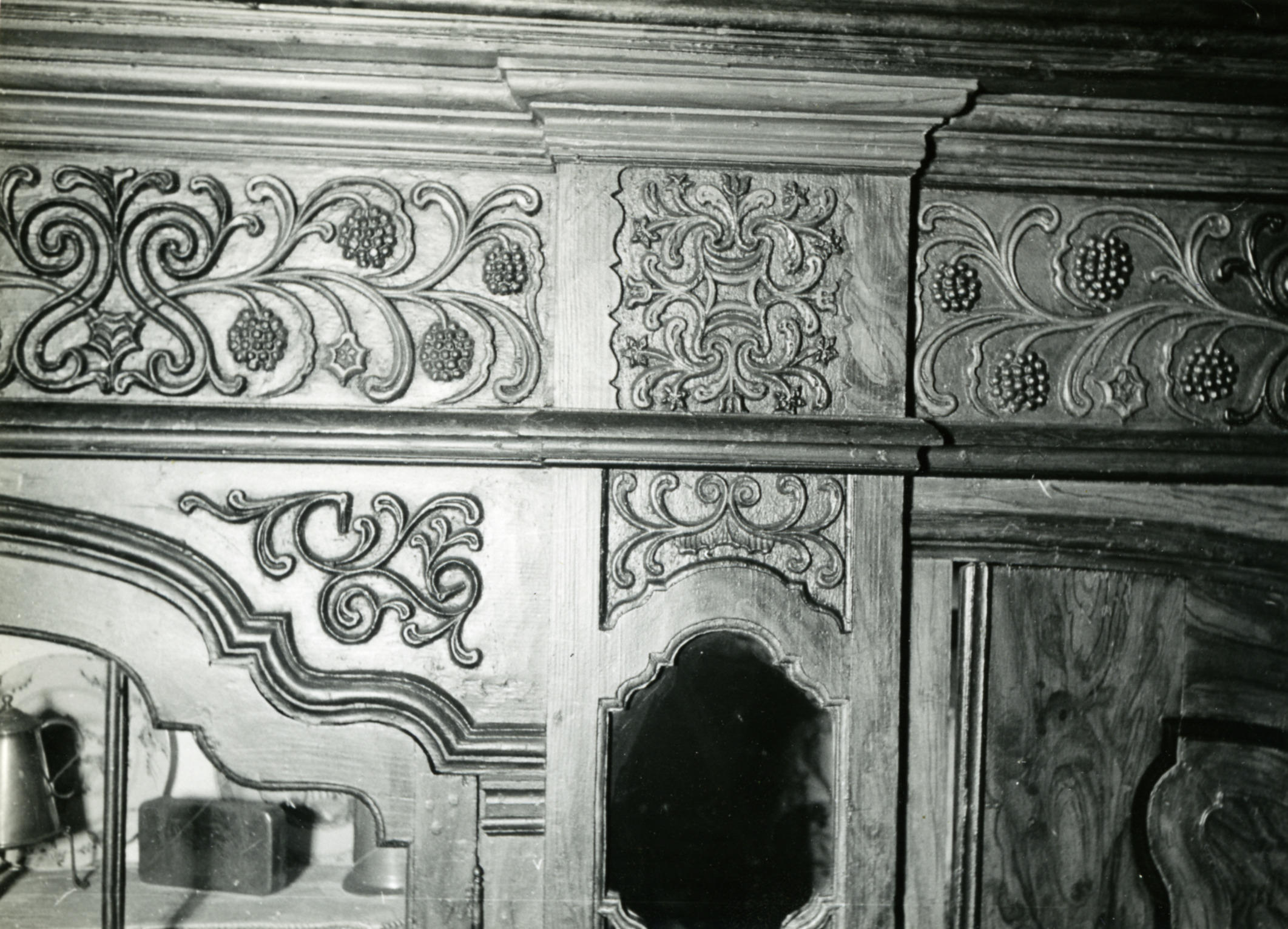 Detail van de bedstedewand in de zogenoemde Westerwoldse Kamer, een stijlkamer in het Gronings Museum voor Stad en Lande aan de Praediniussingel in Groningen. De vurenhouten bedstedewand, versierd met houtsnijwerk en beschilderd met notenhoutimitatie, werd in 1903 verworven uit een afgebroken boerderij in Bellingwolde.