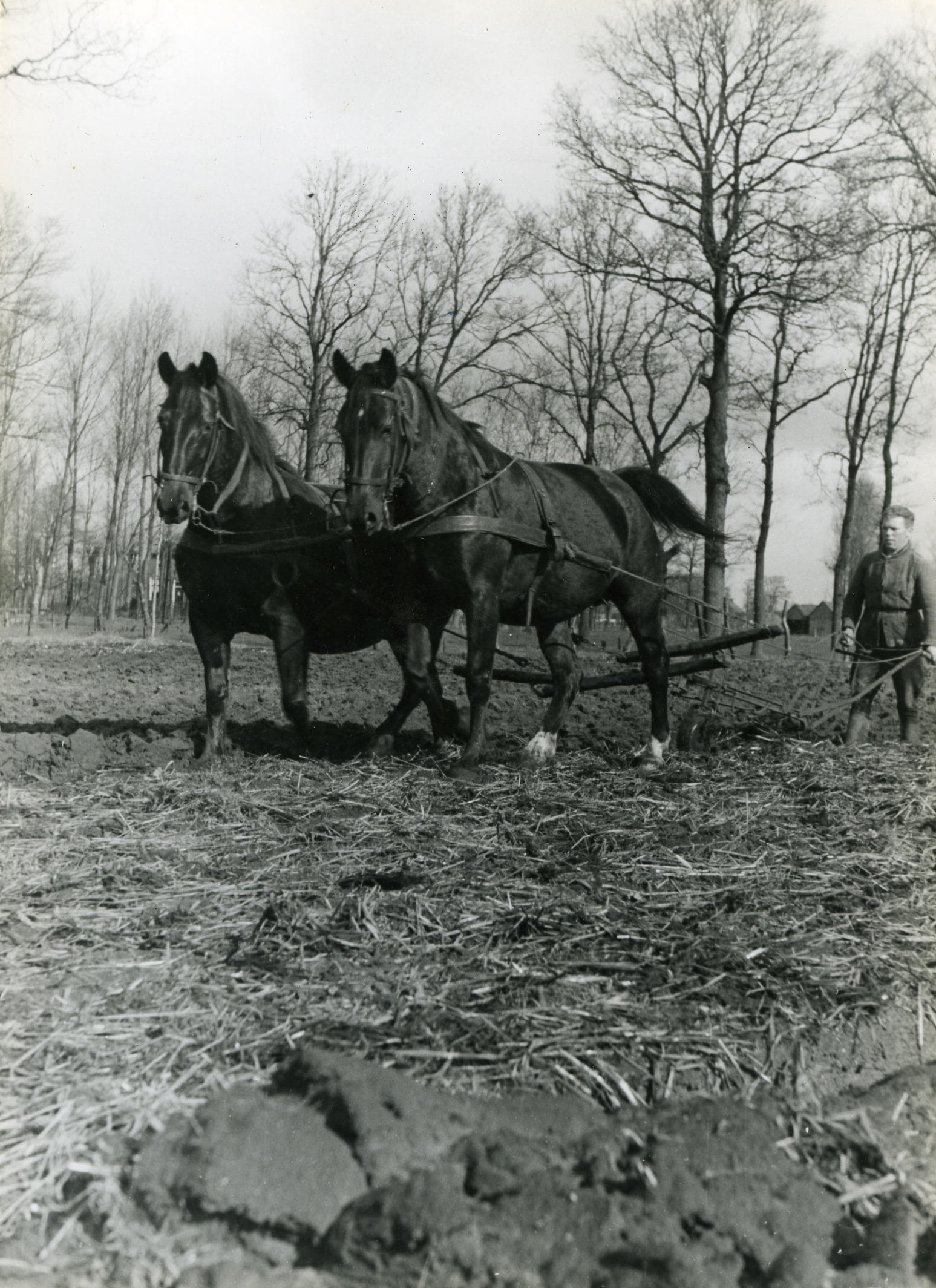 Ploegen met twee paarden, Orvelte, 1944 (zwart-wit foto)