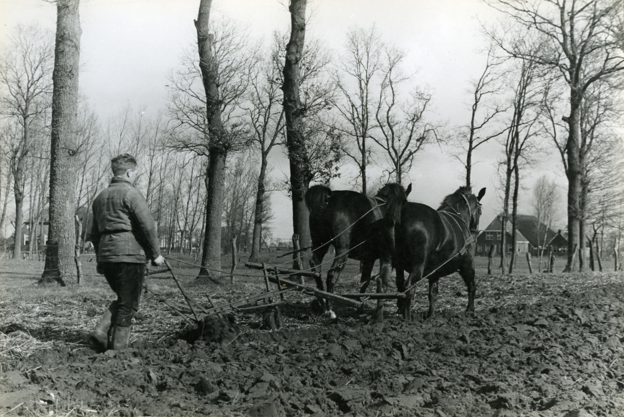 Ploegen met twee paarden, Orvelte, 1944 (zwart-wit foto)