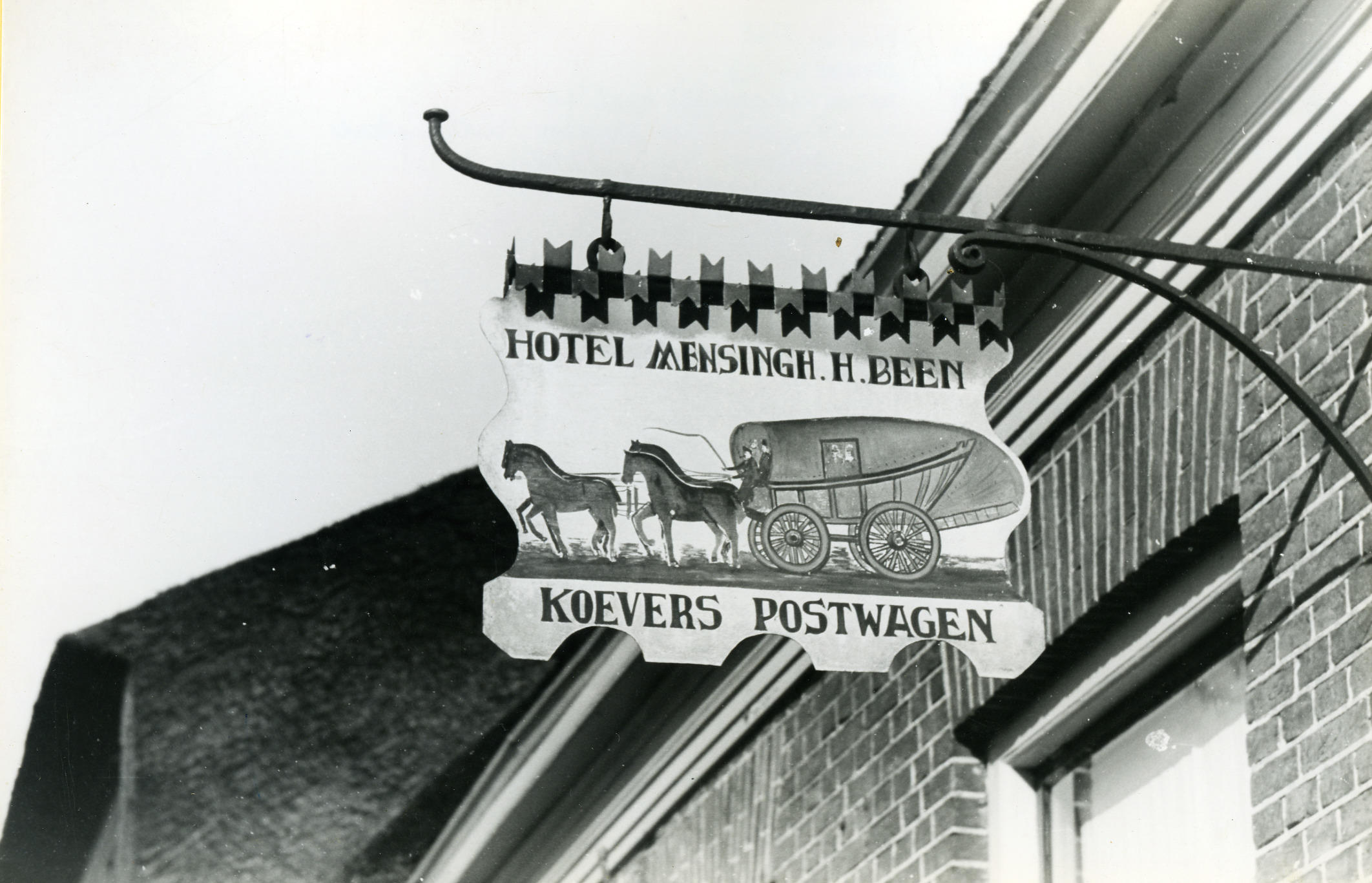 Uithangbord met daarop een afbeelding van een wagen met vier paarden. Het bord hangt aan de gevel van Hotel Mensingh, 'Koevers Postwagen' in Zweeloo.