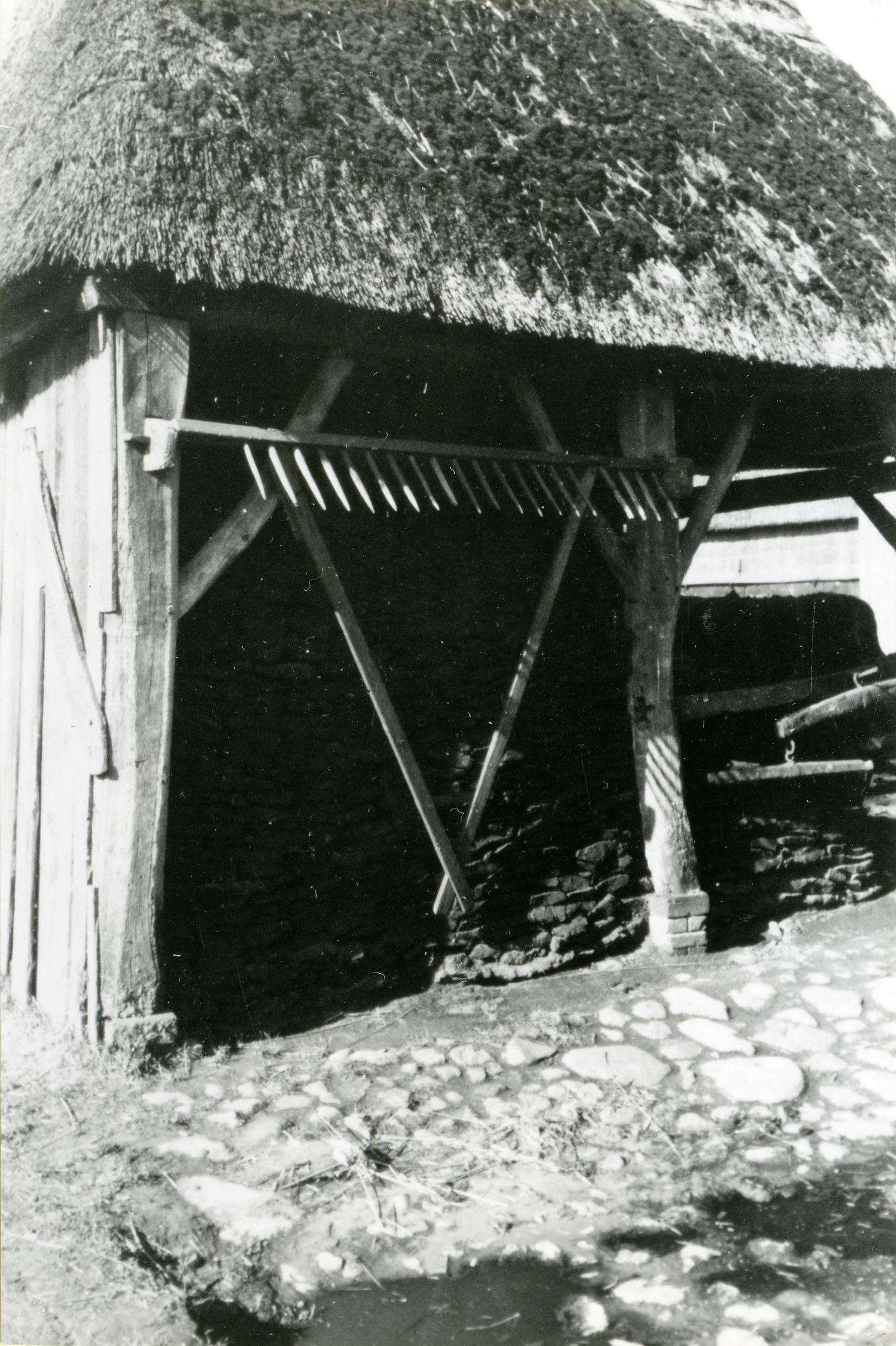 Zuddenschuur in Orvelte. Zudden zijn als brandstof gestoken heideplaggen. Aan de schuur hangt een 'trekrief'. Met een dergelijke hark worden de losse aren van de akker geharkt. Het erf is verhard met veldkeien.