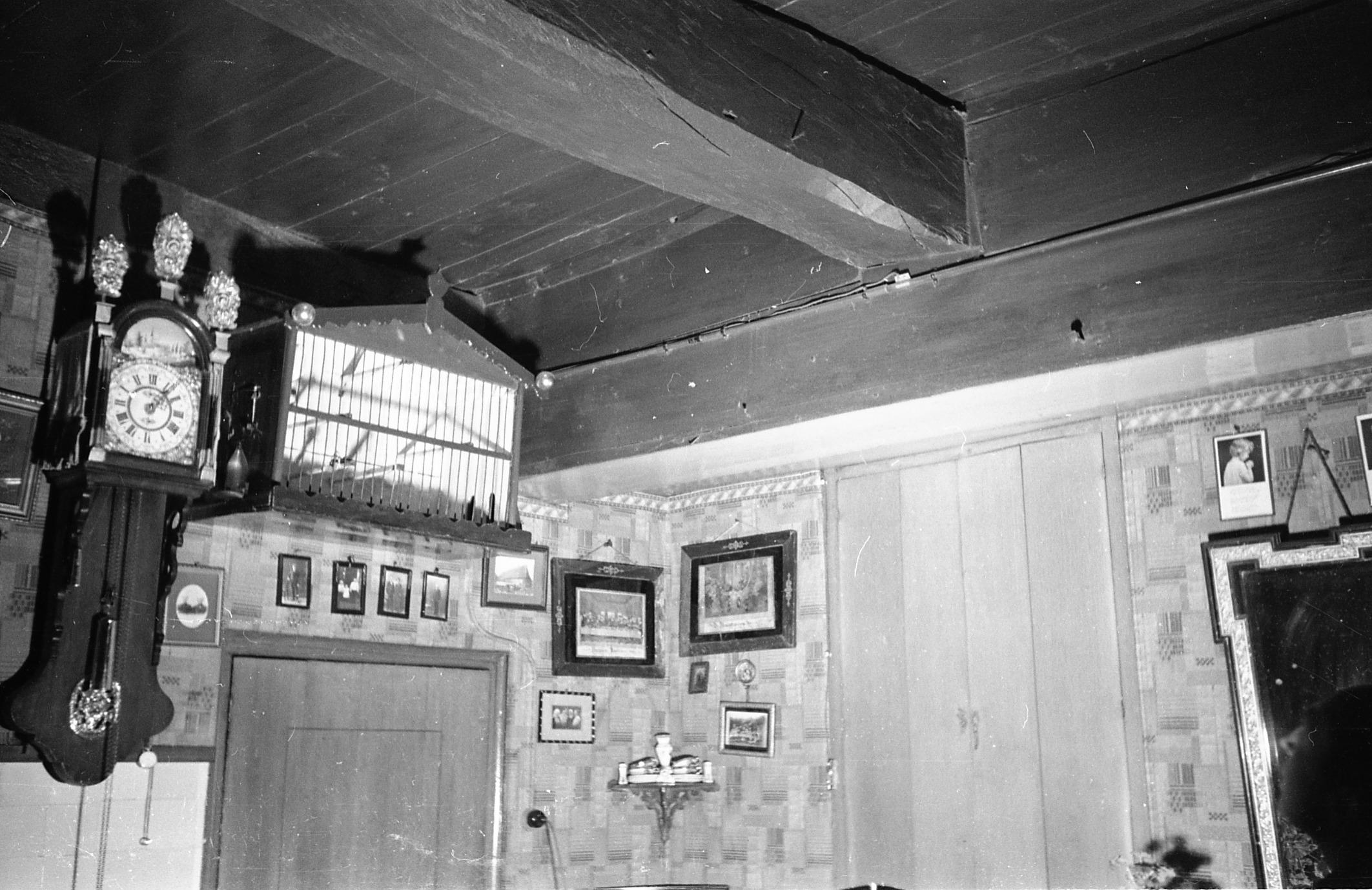 Interieur met een Friese staartklok en een duivenkooi in een boerderij in Orvelte.