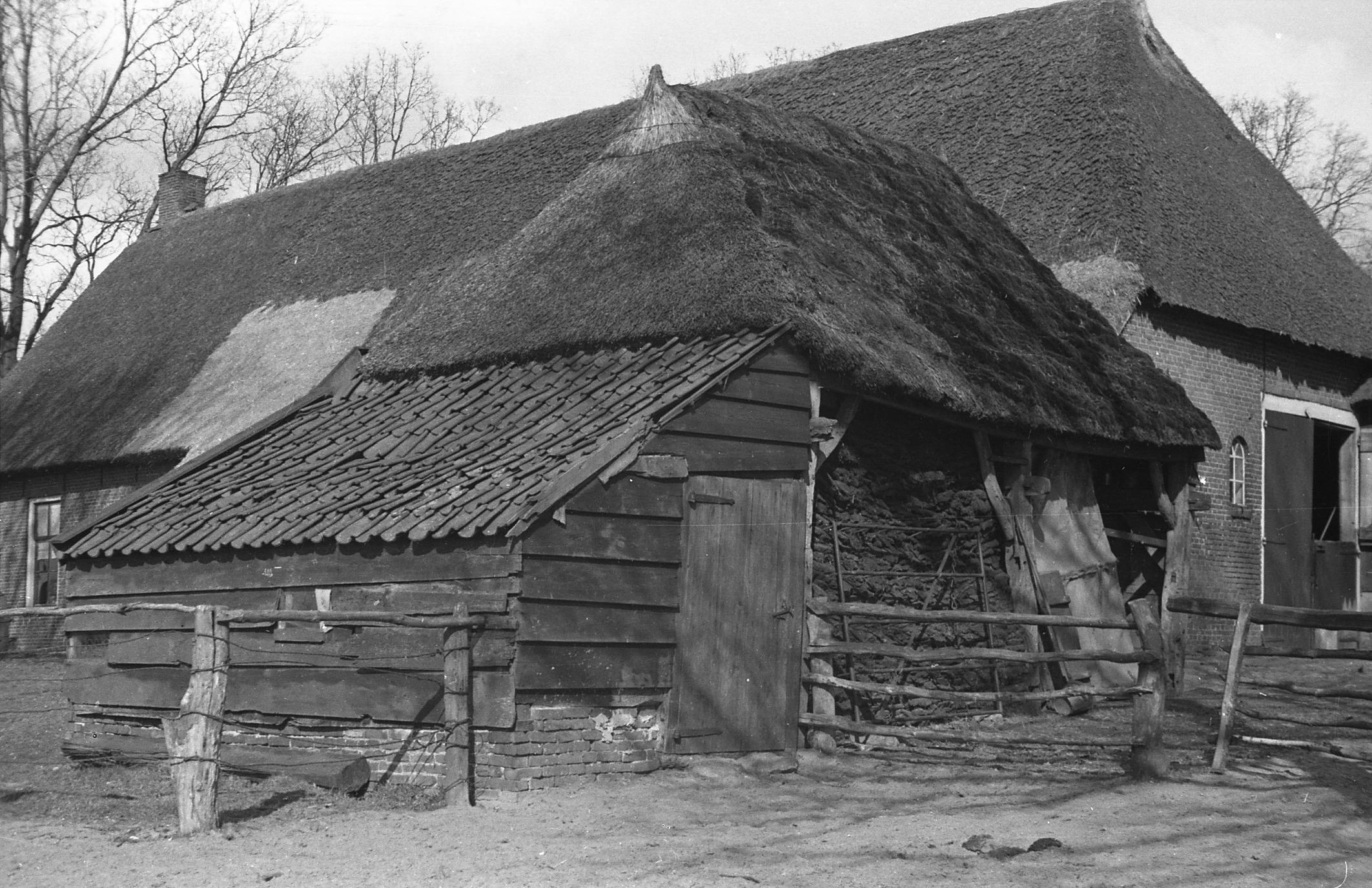 Zogenoemde zuddenschuur met aangebouwd varkenshok bij een boerderij in Hooghalen. Zudden zijn als brandstof gestoken heideplaggen.