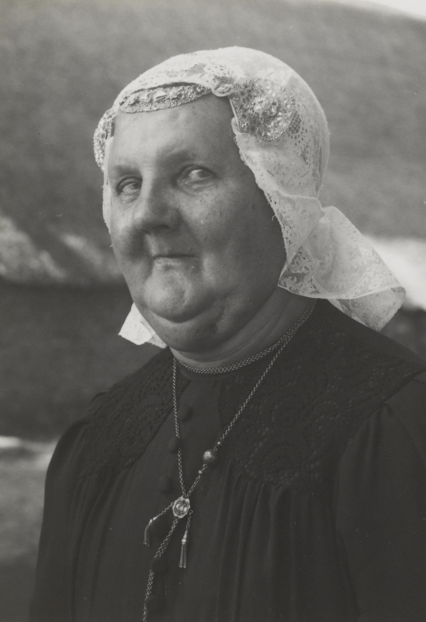 Vrouw uit Uffelte in Drentse streekdracht, op bezoek in het Nederlands Openluchtmuseum. Ze draagt een gouden oorijzer met gouden stiften, een voorhoofdsplaat en 'roosjes' (mutsspelden). Om haar hals heeft ze een gouden jasseronketting met schuifje en tonslotje.