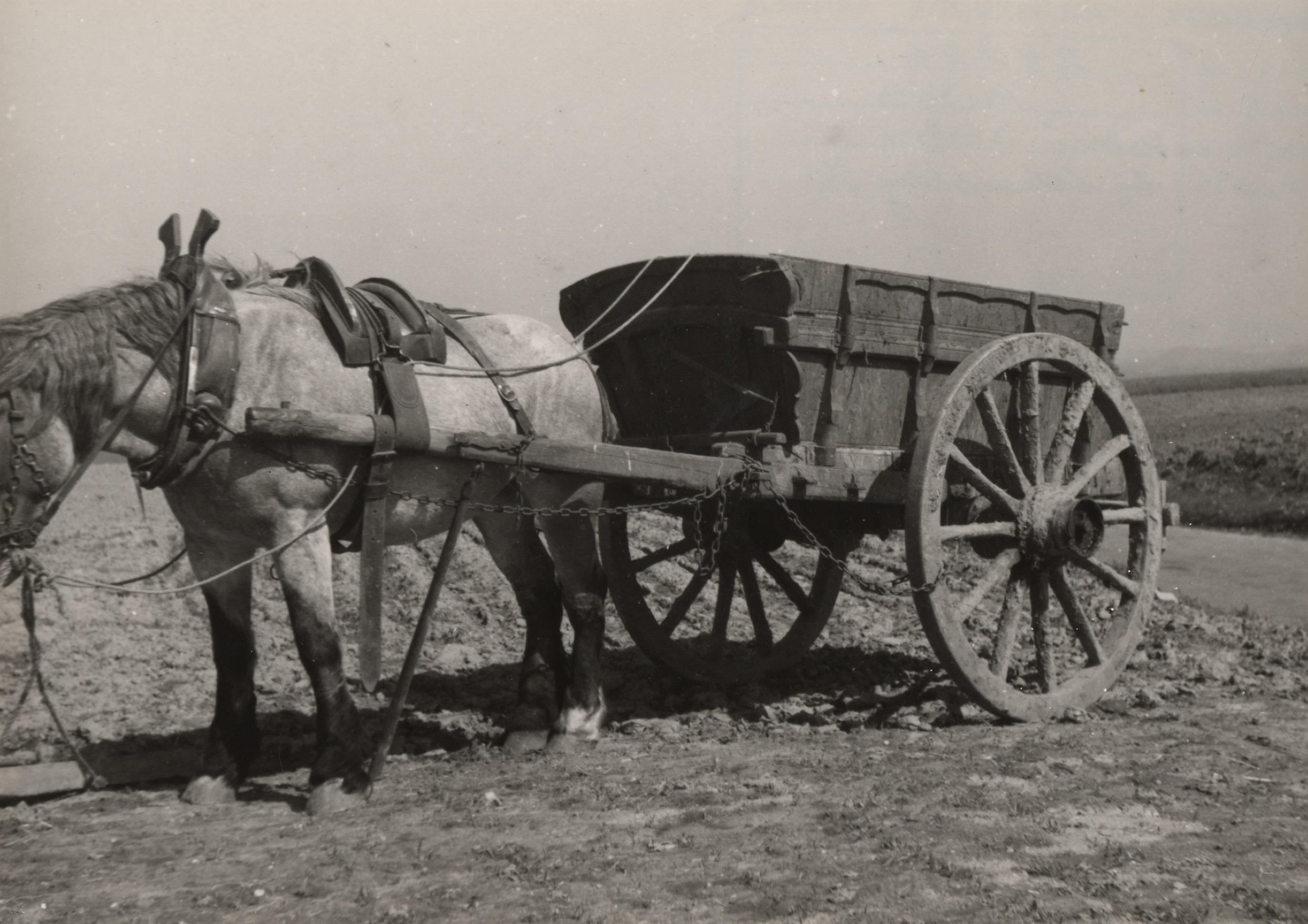 Kar met paard bij Ubachsberg, 1950 (zwart-wit foto)