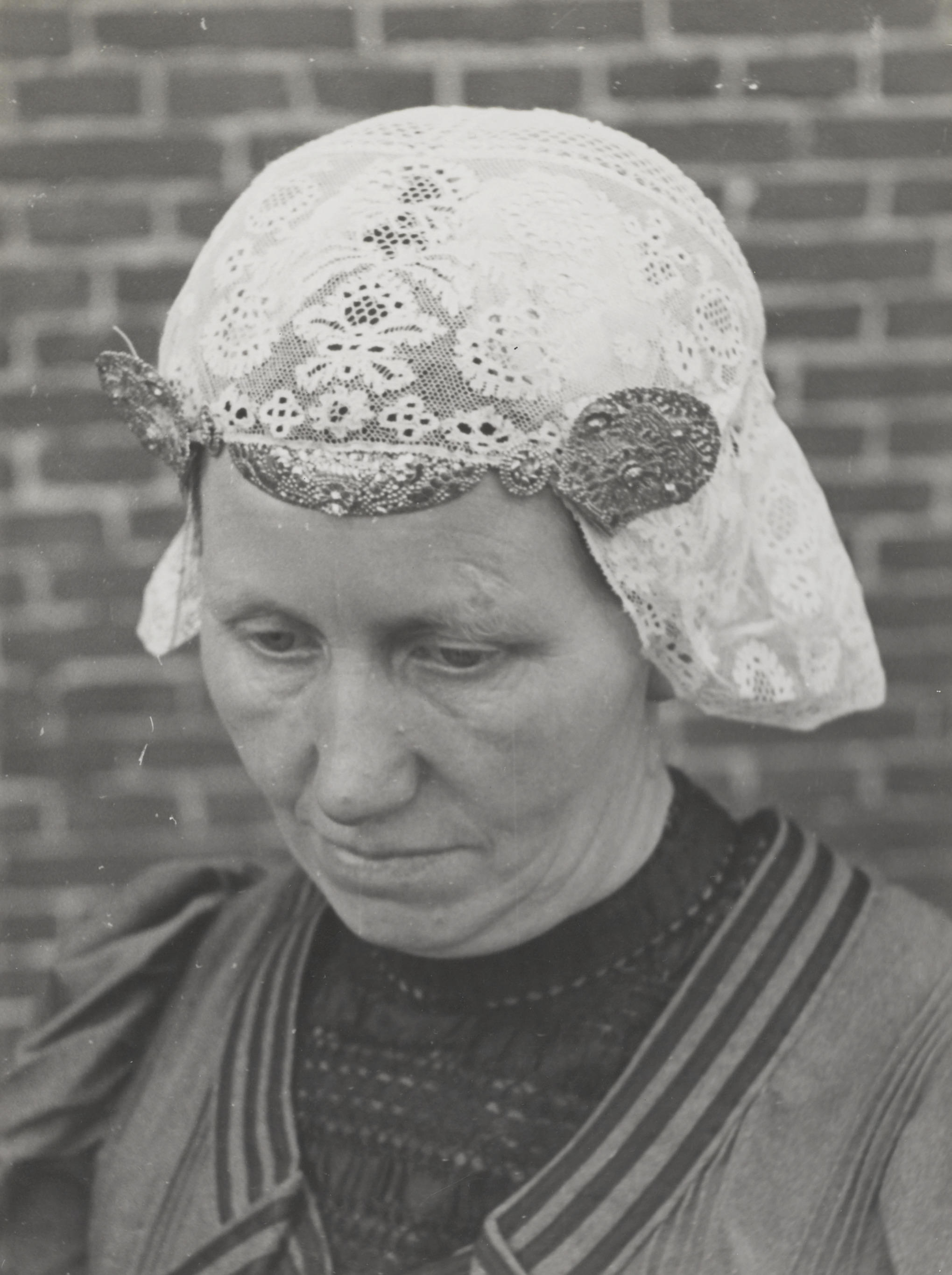 Vrouw uit Hooghalen, gekleed in Drentse streekdracht. Ze draagt de zondagse dracht. Over een witte ondermuts en een zwarte tussenmuts draagt ze een gouden oorijzer. Het oorijzer heeft aan de uiteinden twee gouden 'stiften', versierd met filigrein. De gouden voorhoofdsplaat is ook versierd met filigrein. Over het oorijzer draagt ze de zogenoemde 'floddermuts'. Deze floddermuts ...