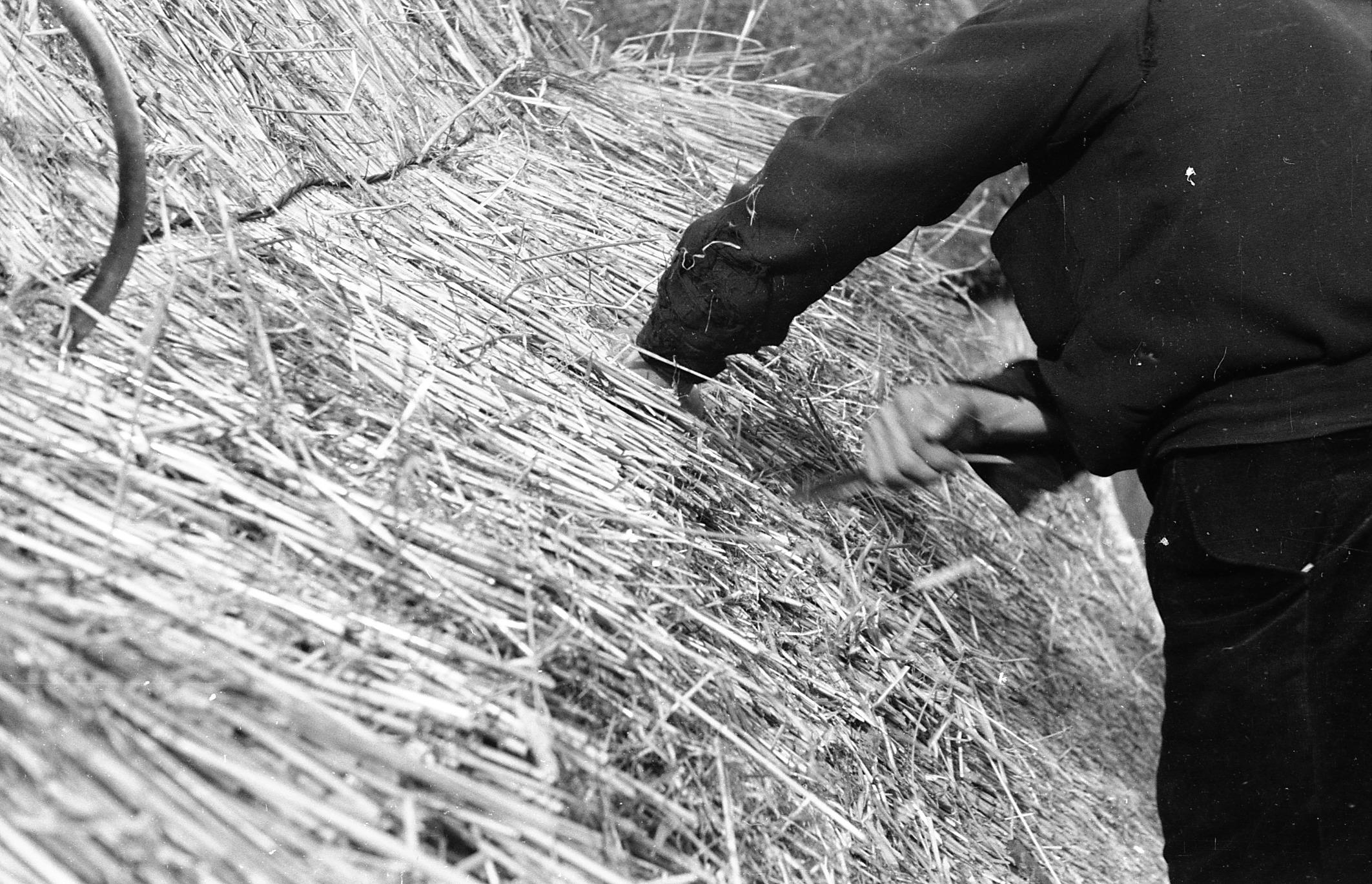 Dakdekker aan het werk bij een boederij in Beilen. Het dak wordt gedekt met stro.