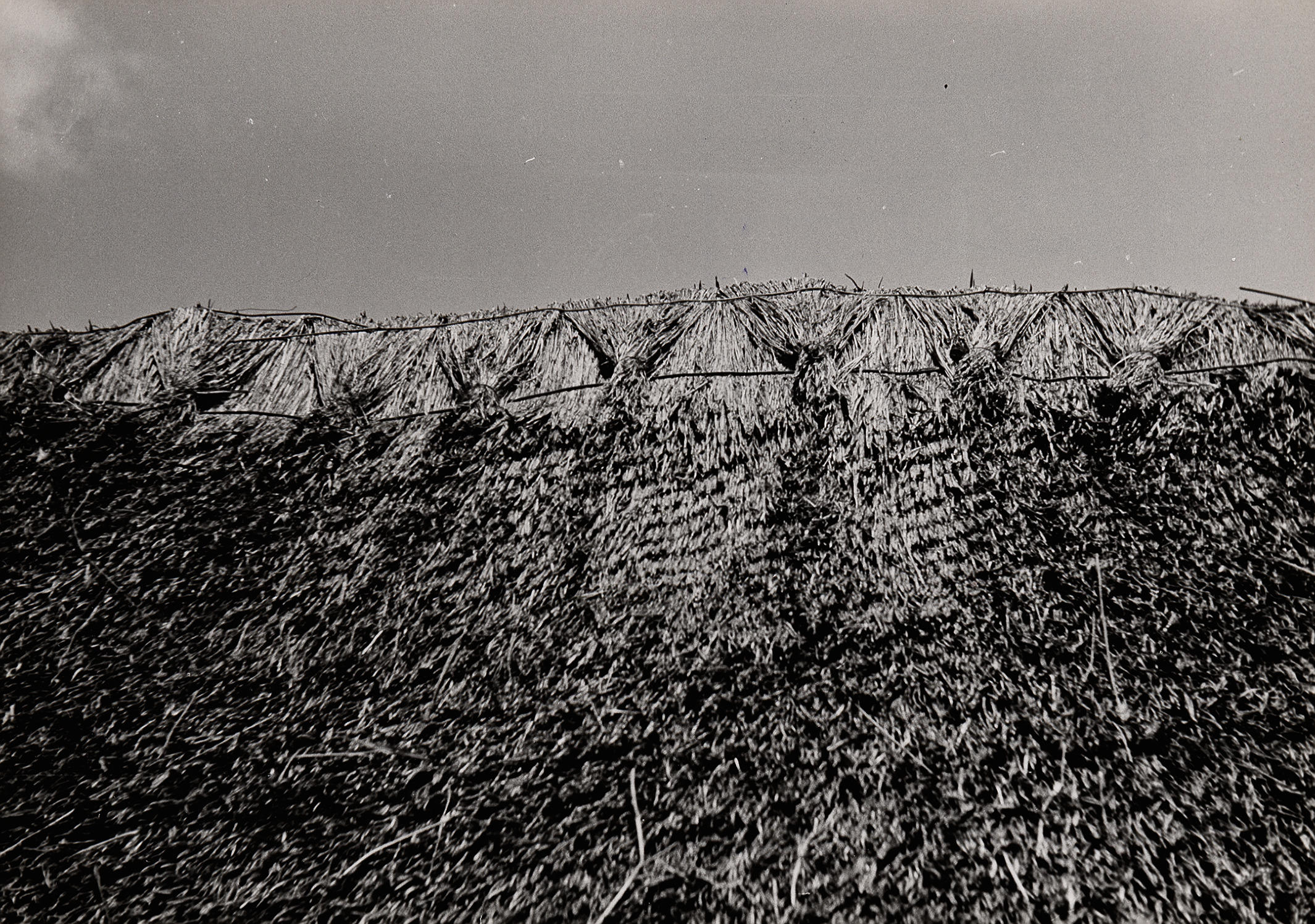 Afwerking van de nok van het rieten dak van een boerderij in Staphorst. Deze boerderij is in 1950 afgebroken en vervolgens overgebracht naar het Nederlands Openluchtmuseum in Arnhem.