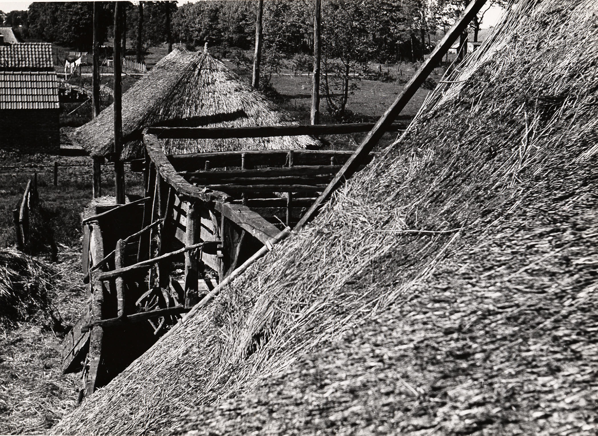 Afbraak van boerderij, Staphorst, 1950 (zwart-wit foto)