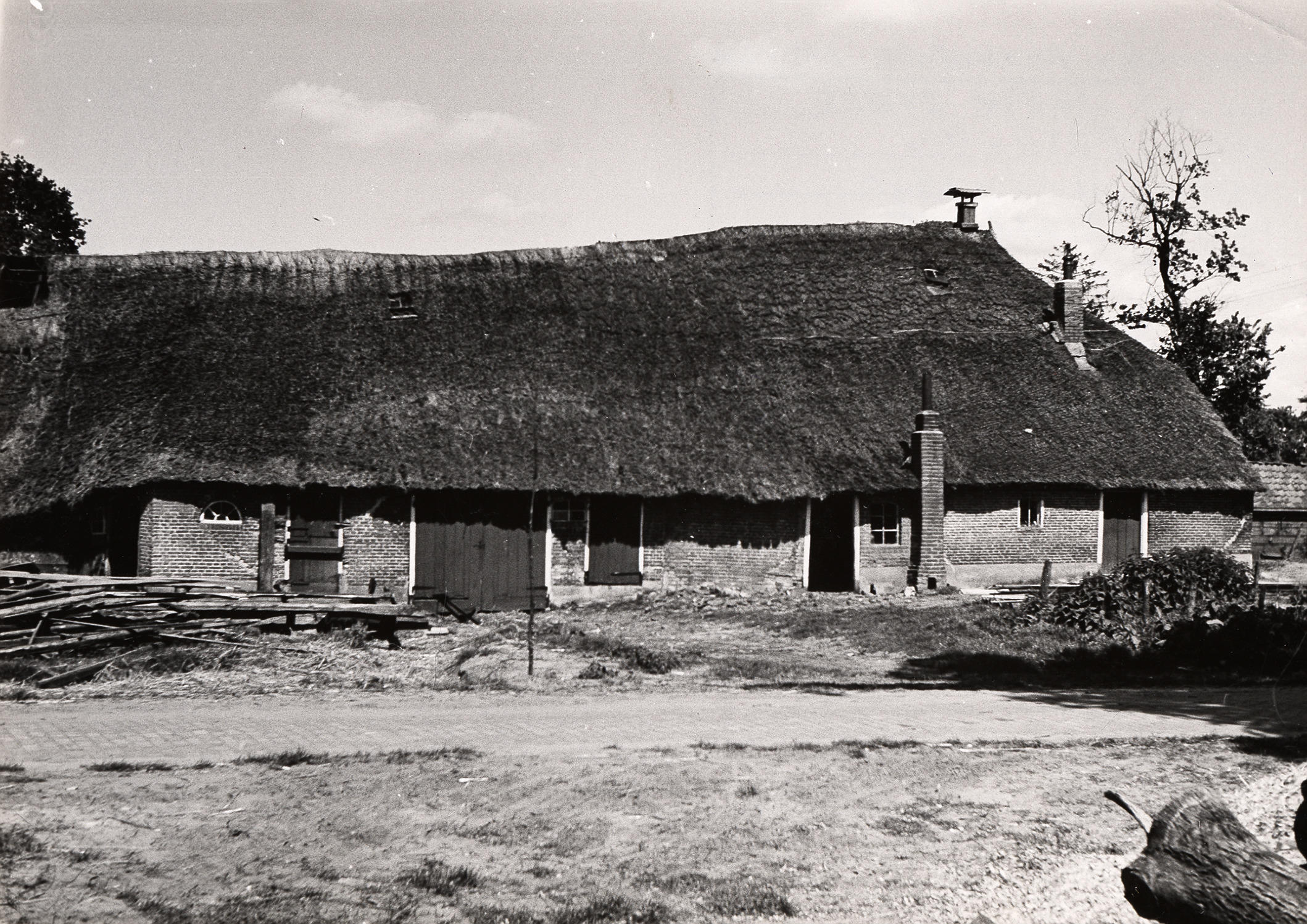 Afbraak van boerderij, Staphorst, 1950 (zwart-wit foto)