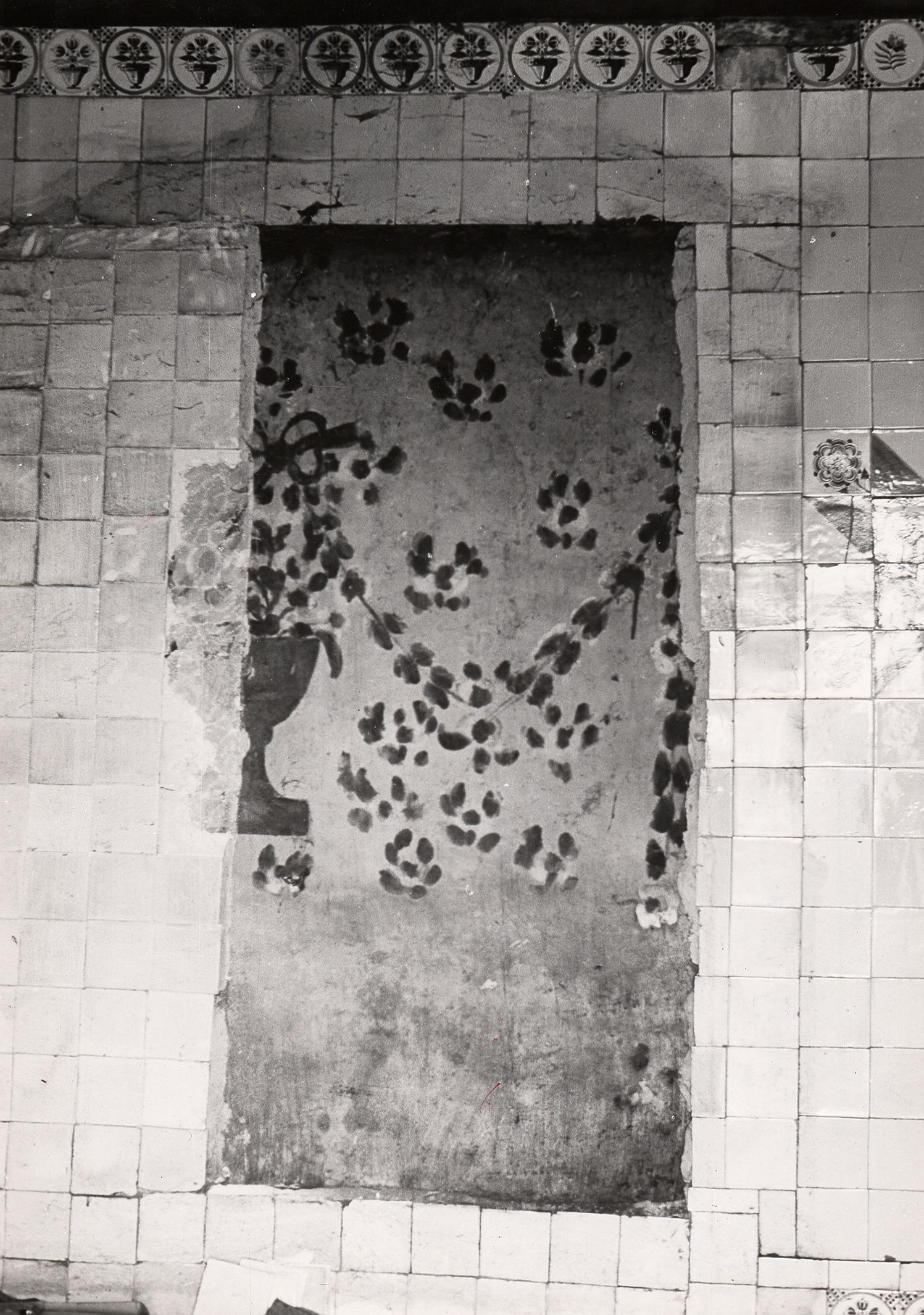Wandbeschildering op de achtermuur van de woonkamer van een boerderij in Staphorst. De beschildering is voor 1898 aangebracht door de Meppeler huisschilder Hartog Simon Goldsteen. Naderhand is de wand grotendeels betegeld, behalve het gedeelte van de wand dat achter het kabinet verdween. Deze boerderij is in 1950 afgebroken en vervolgens overgebracht naar het Nederlands Openluchtmuseum ...