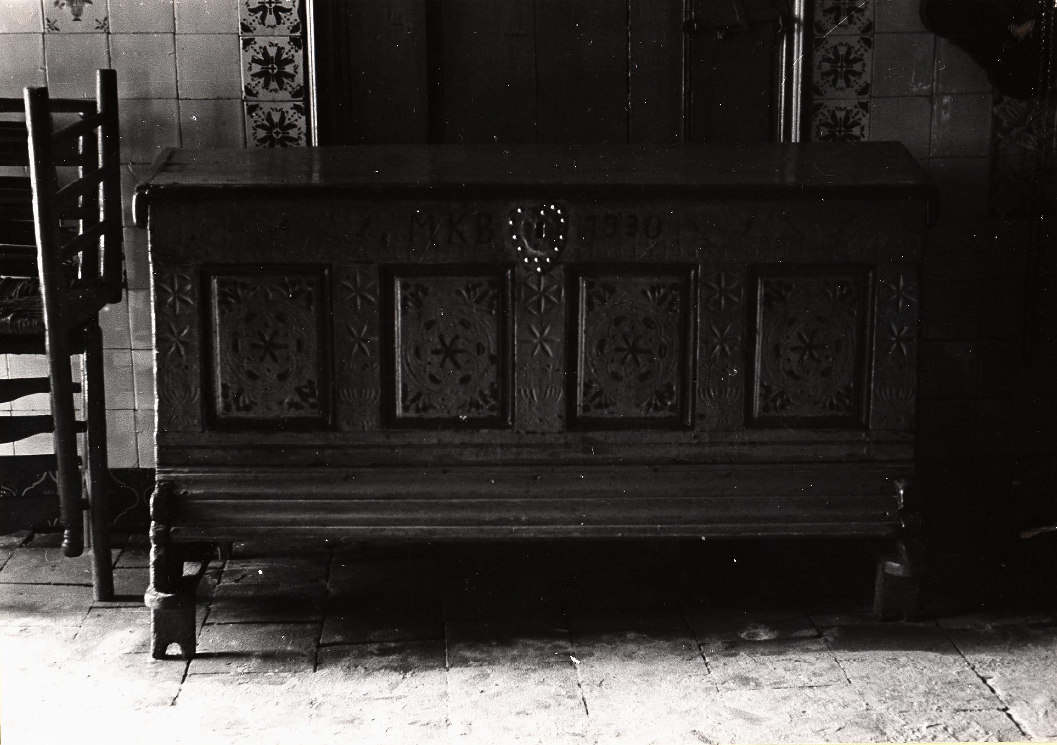 Kist in interieur, Staphorst, 1950 (zwart-wit foto)