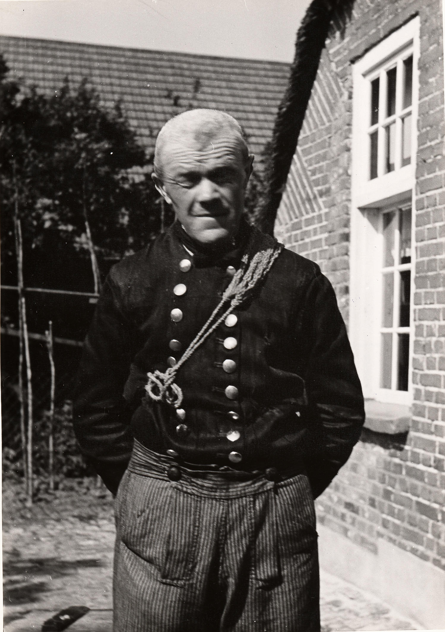 Klaas Haasjes uit Staphorst, gekleed in zomerse werkdracht, heeft een etensnetje omgeknoopt. Over zijn hemd draagt hij een hemdrok, gesloten door een dubbele rij blikken knopen. Verder draagt hij een gestreepte onderbroek met klep, die in de zomer als werkgoed gedragen werd. Om zijn hals heeft hij een tot das omgerolde halsdoek.