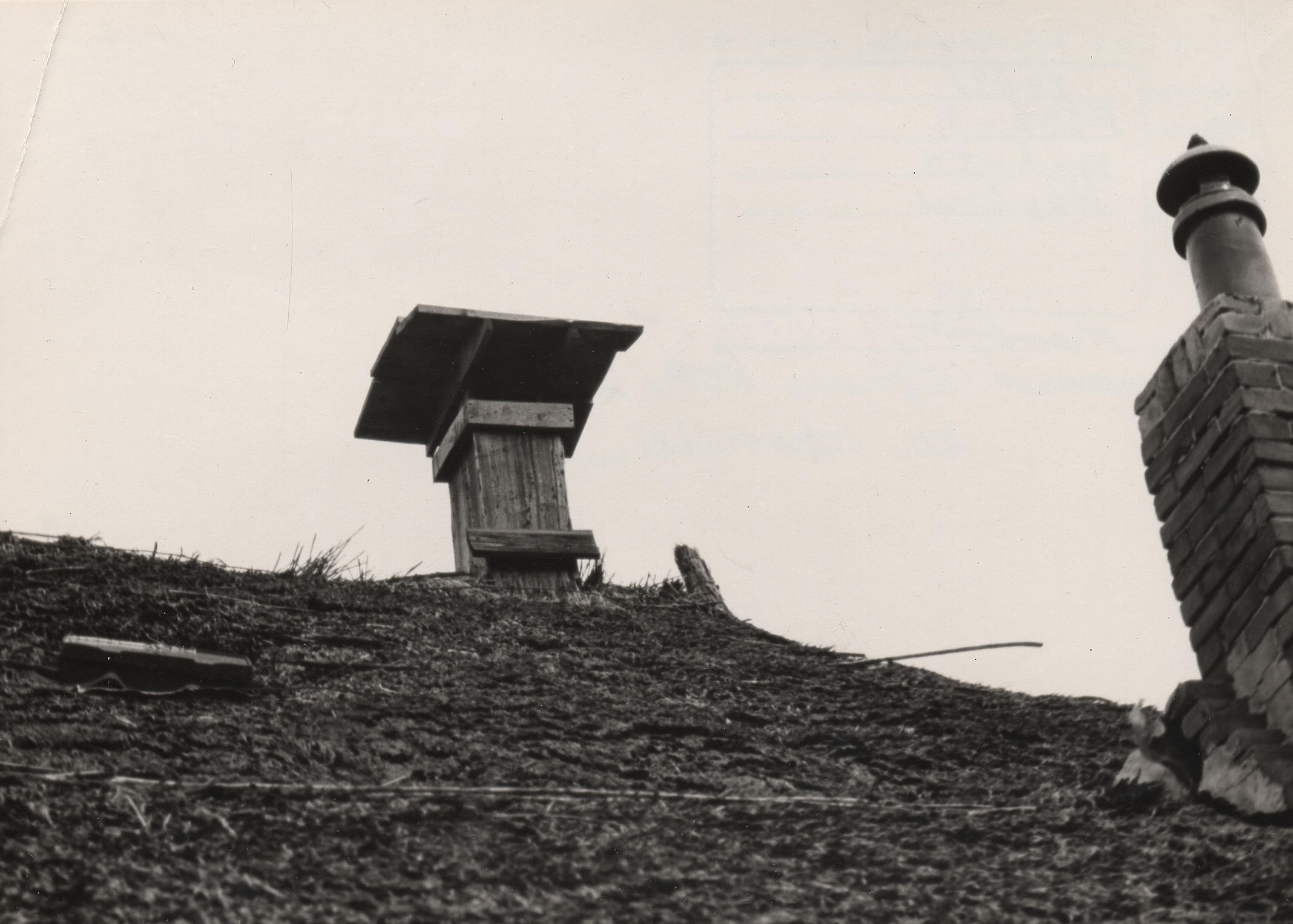 Schoorstenen op een boerderij in Staphorst. Links is de houten schoorsteen van de vuurplaats in de woonkeuken te zien; rechts staat de stenen schoorsteen uit de zijkamer. Deze boerderij is in 1950 afgebroken en vervolgens overgebracht naar het Nederlands Openluchtmuseum in Arnhem.