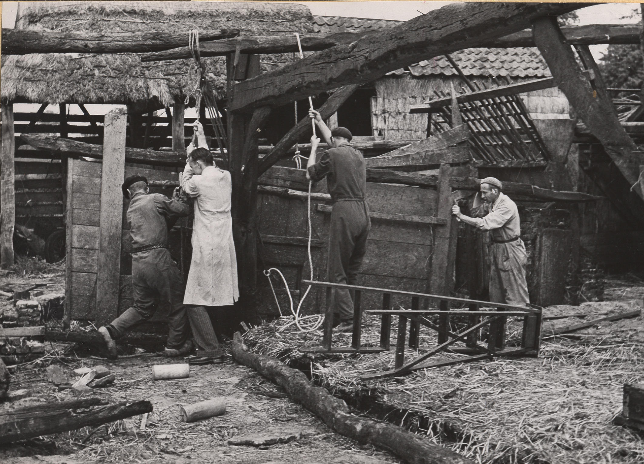 Afbraak van boerderij, Staphorst, 1950 (zwart-wit foto)