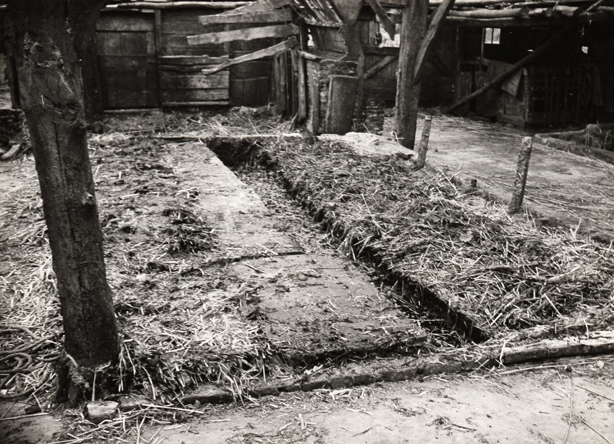 Afbraak van boerderij, Staphorst, 1950 (zwart-wit foto)