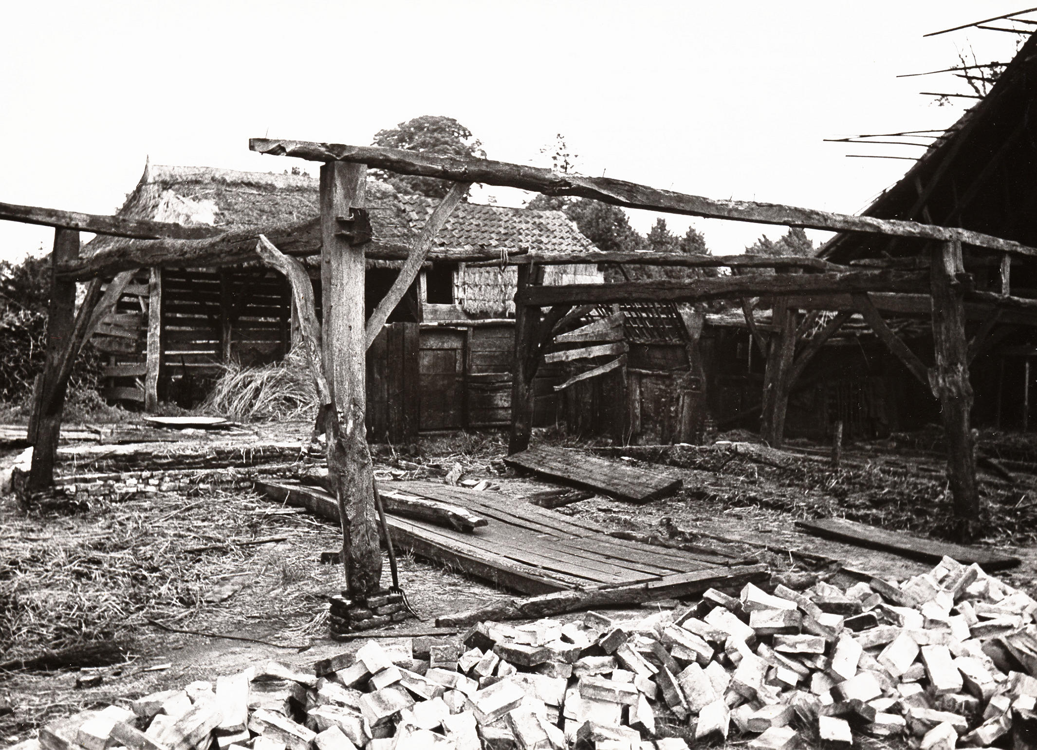 Afbraak van boerderij, Staphorst, 1950 (zwart-wit foto)