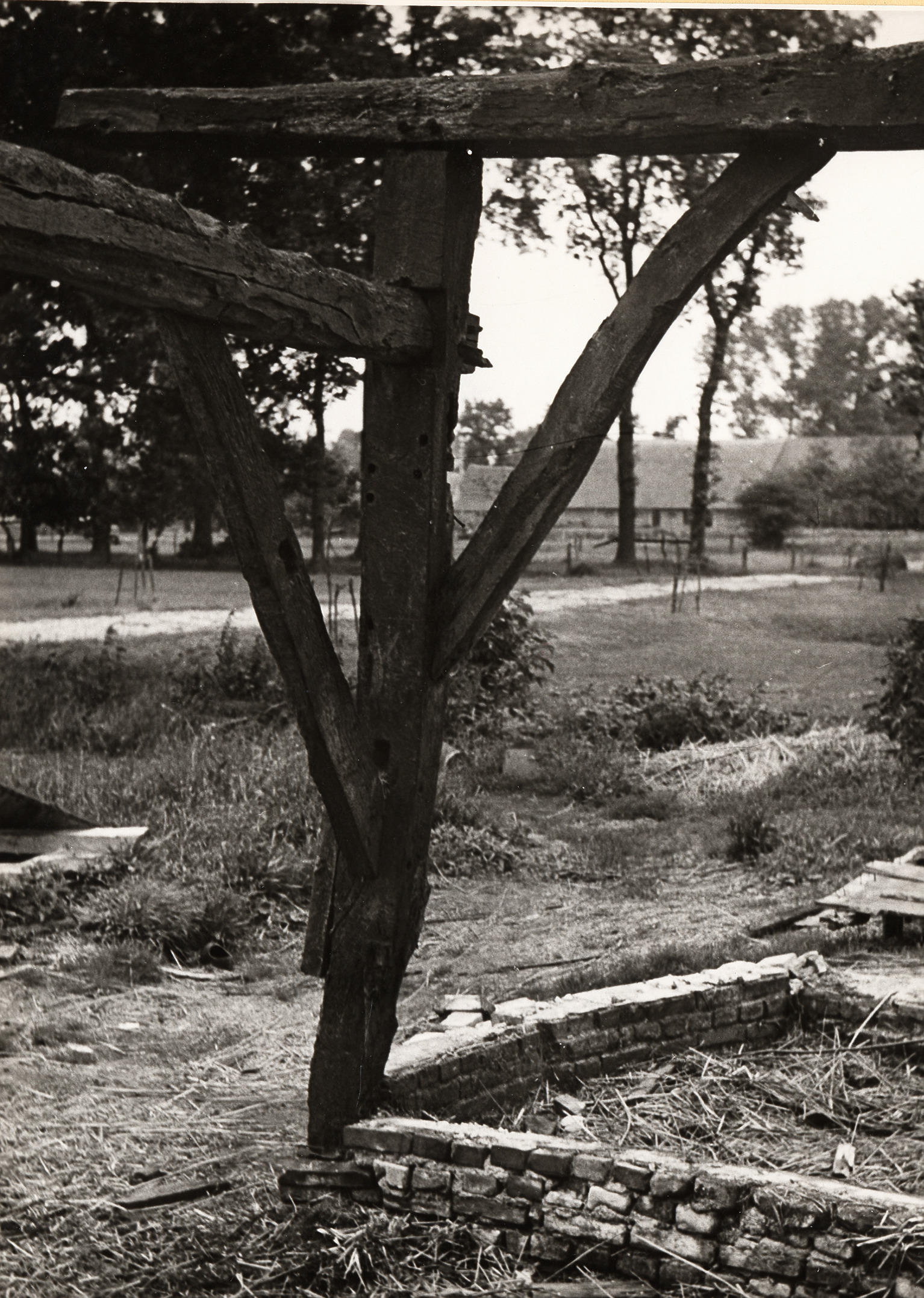 Afbraak van boerderij, Staphorst, 1950 (zwart-wit foto)