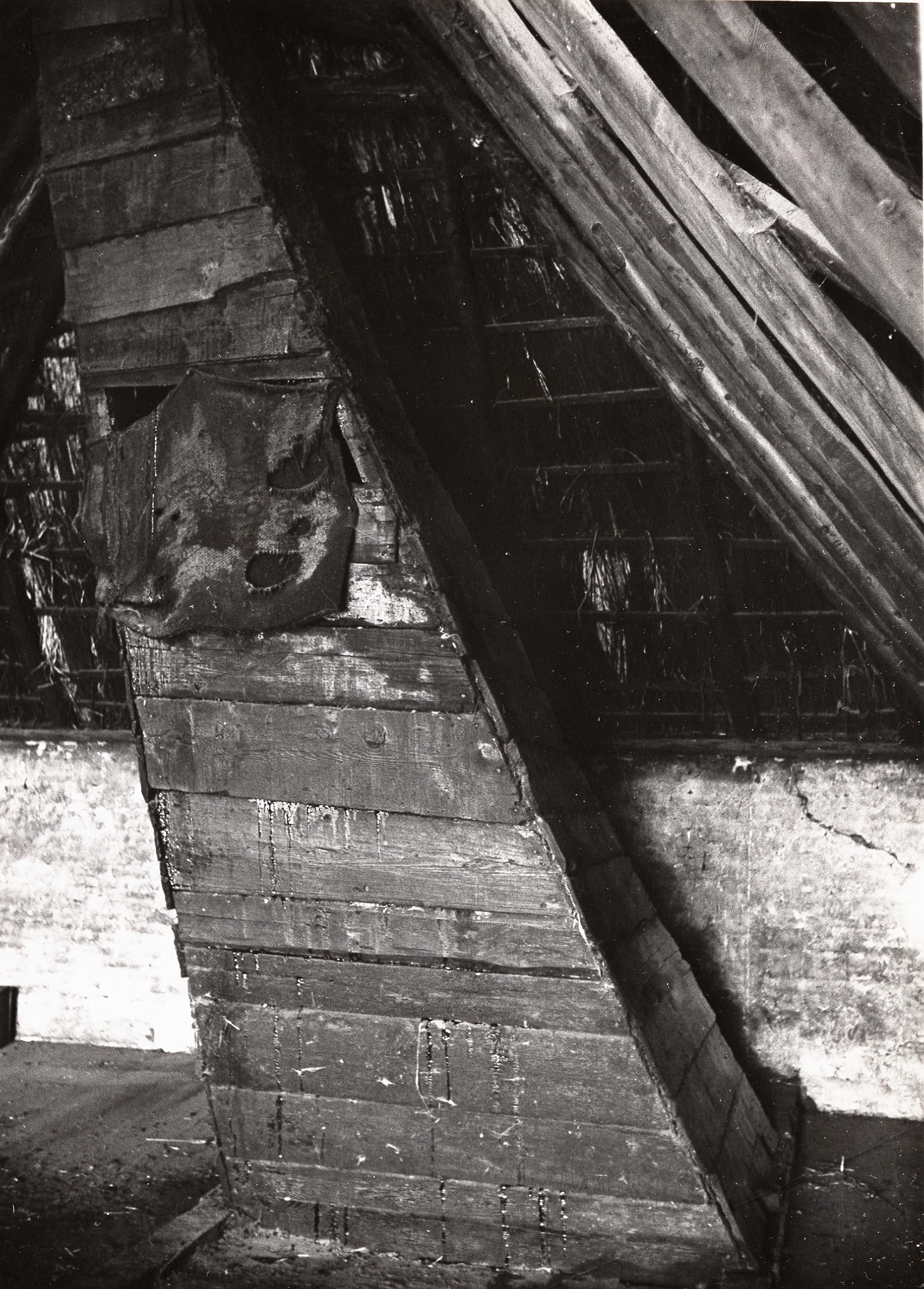 Afbraak van boerderij, Staphorst, 1950 (zwart-wit foto)