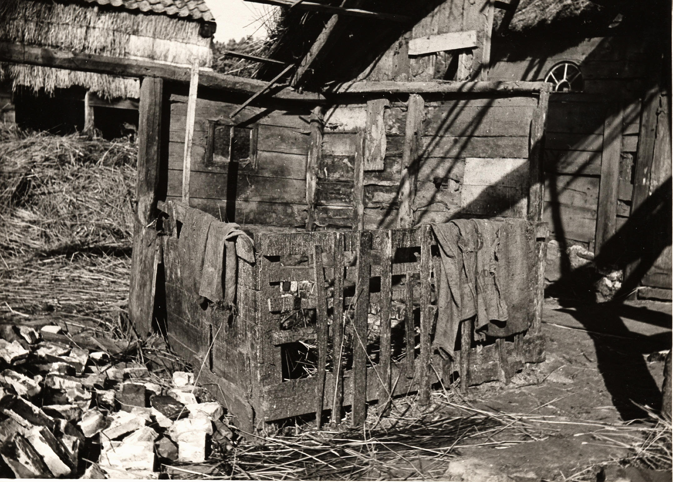 Afbraak van boerderij, Staphorst, 1950 (zwart-wit foto)