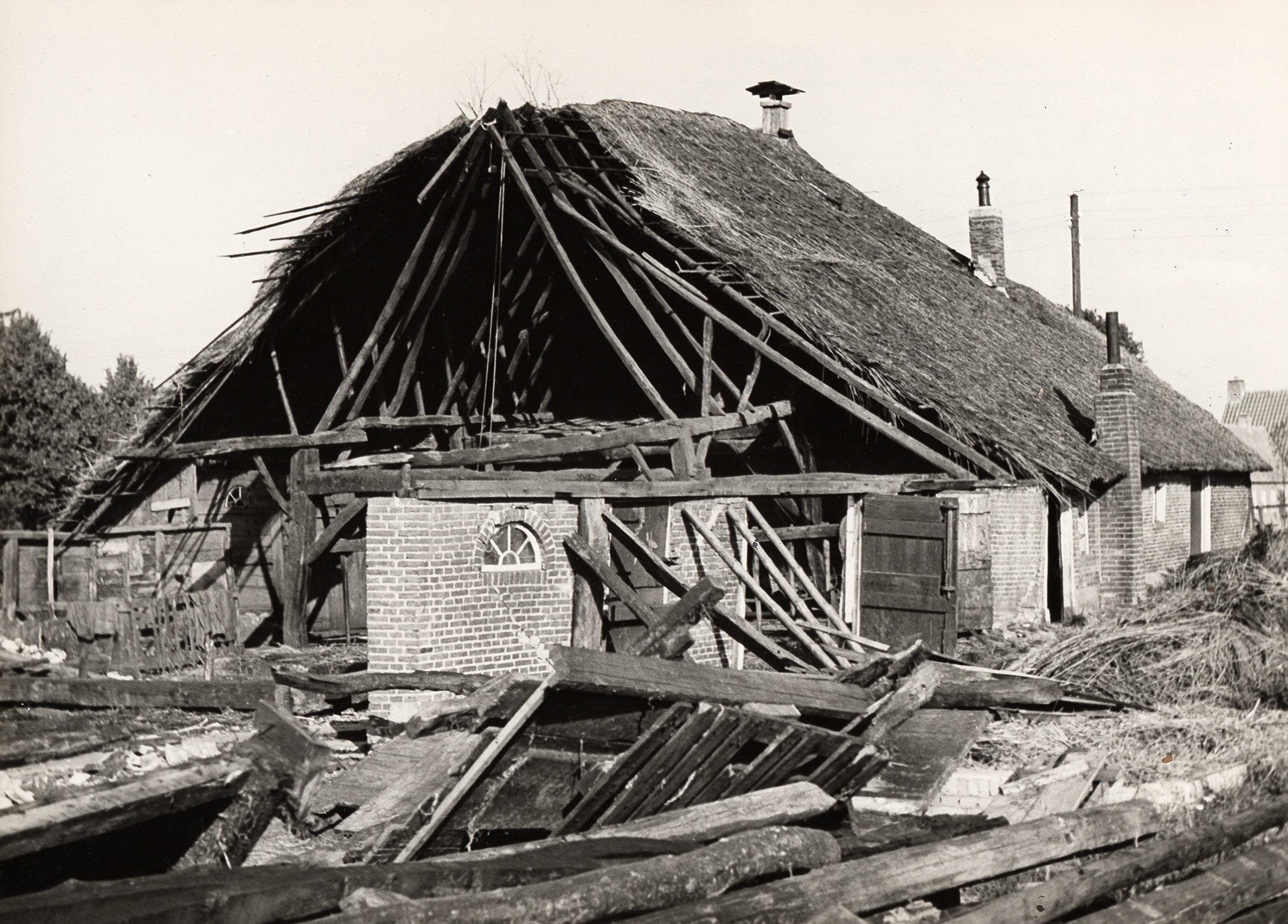 Afbraak van boerderij, Staphorst, 1950 (zwart-wit foto)