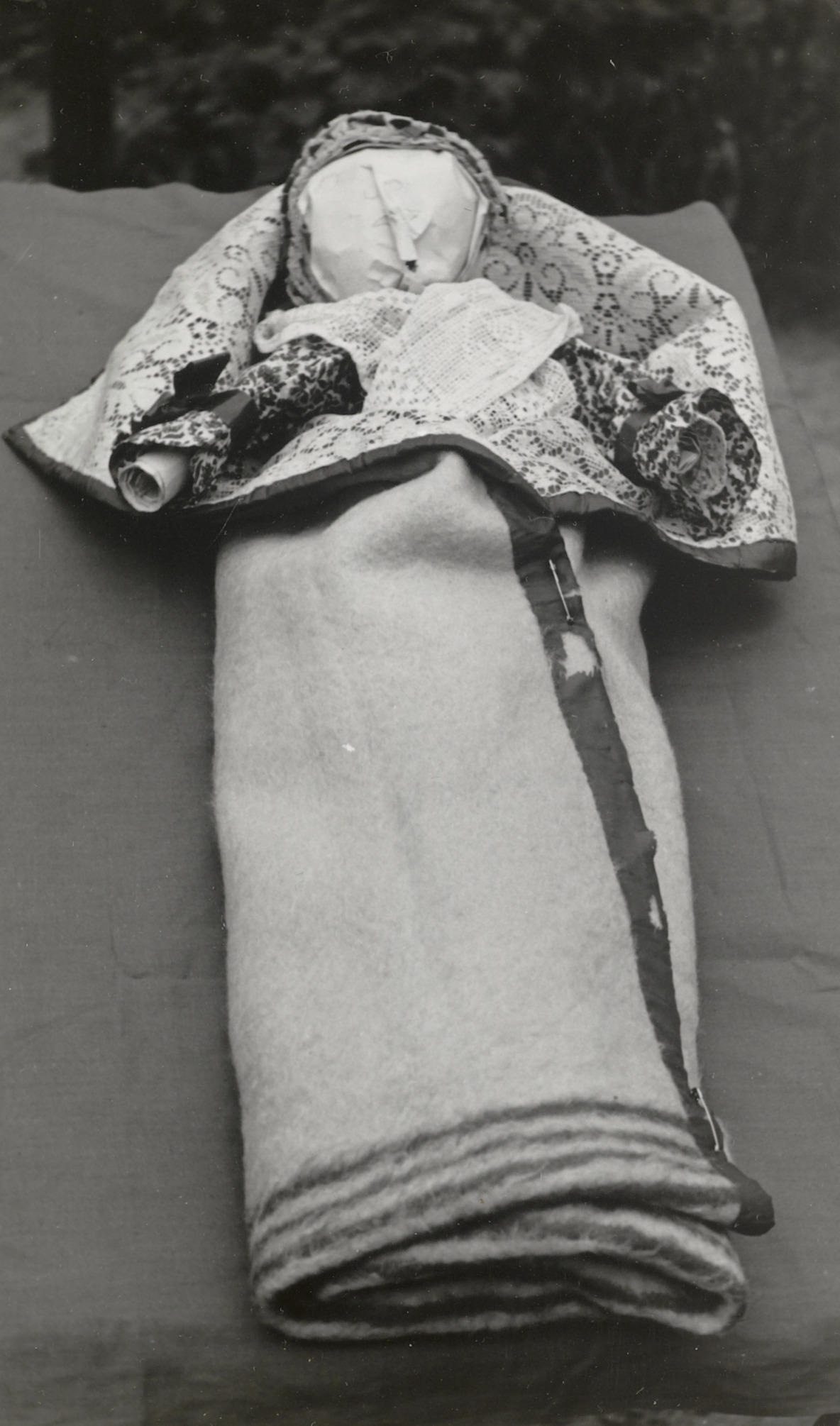 Pop van papier, gekleed in doopkleding uit Staphorst.