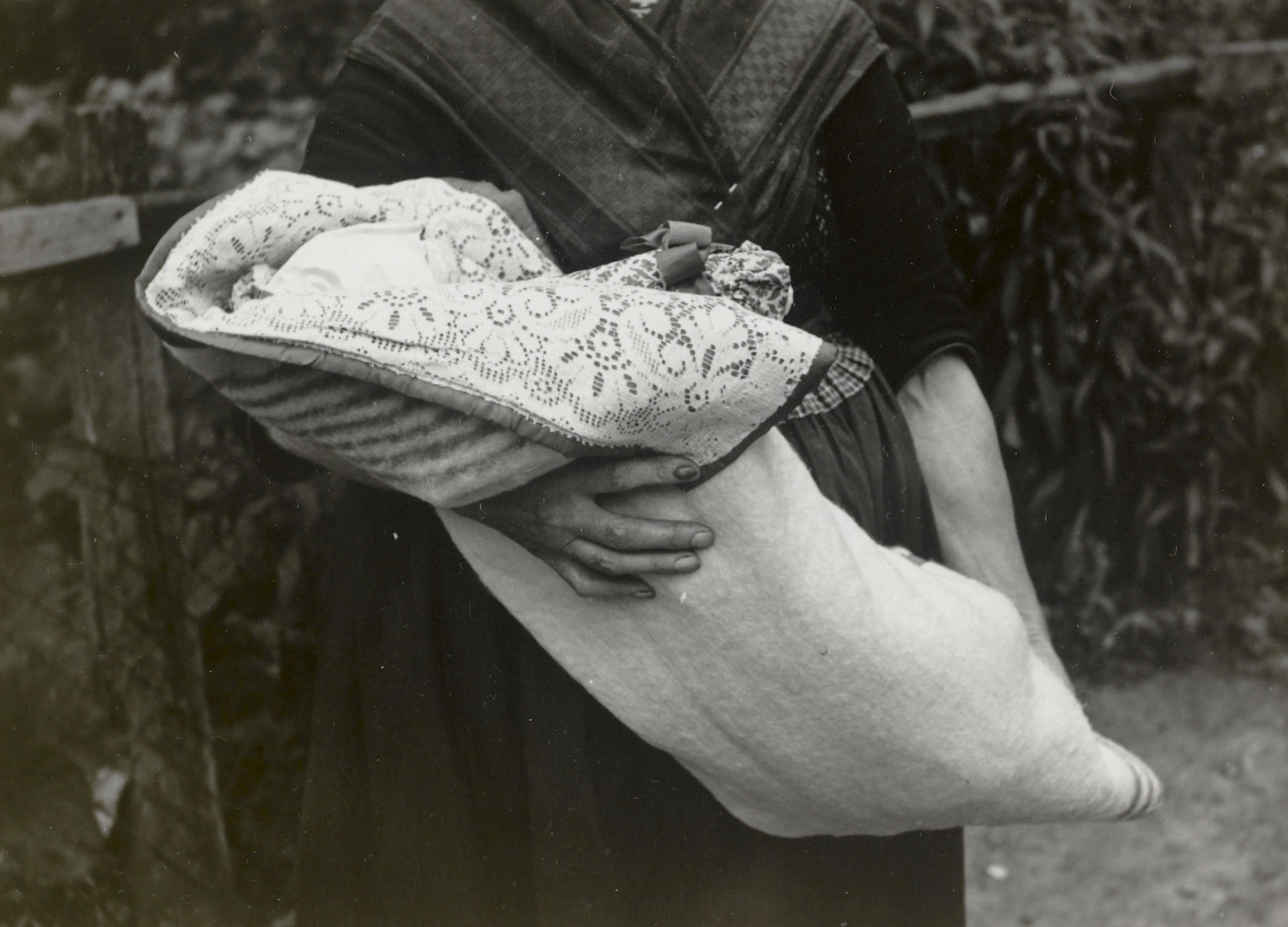 Pop van papier, gekleed in doopkleding uit Staphorst. De pop wordt gedragen door een vrouw in daagse rouwdracht.