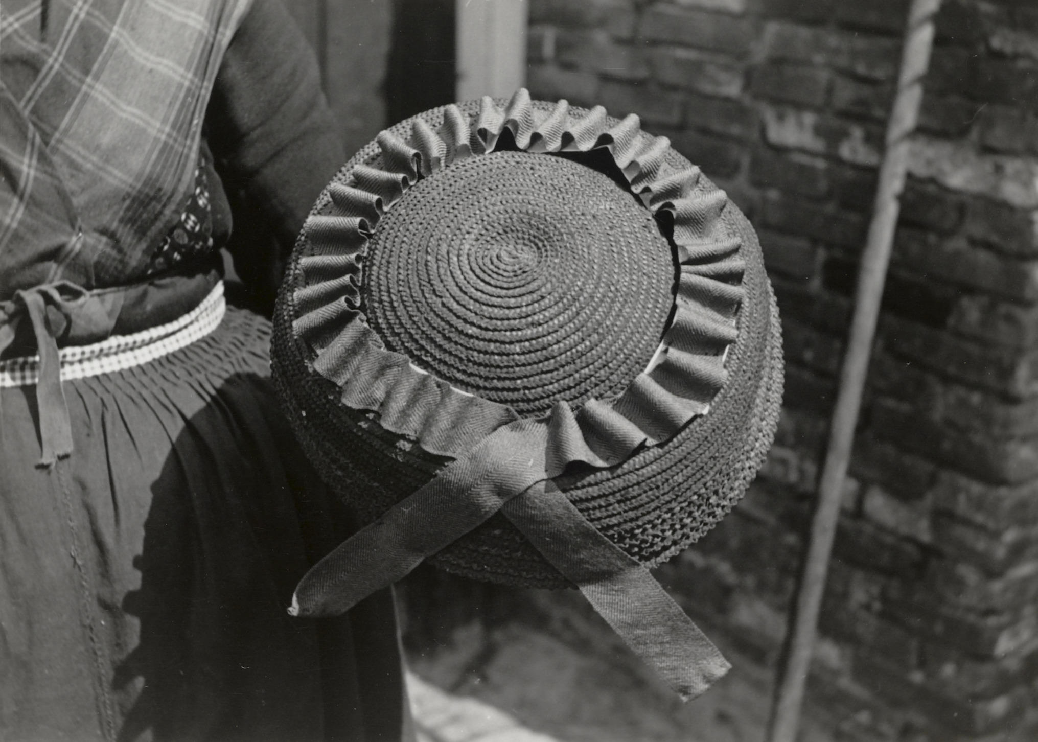 Bovenzijde van een 'flapper' uit Staphorst. Deze strohoeden werden door vrouwen en meisjes gedragen tijdens de oogst, als bescherming tegen de zon.