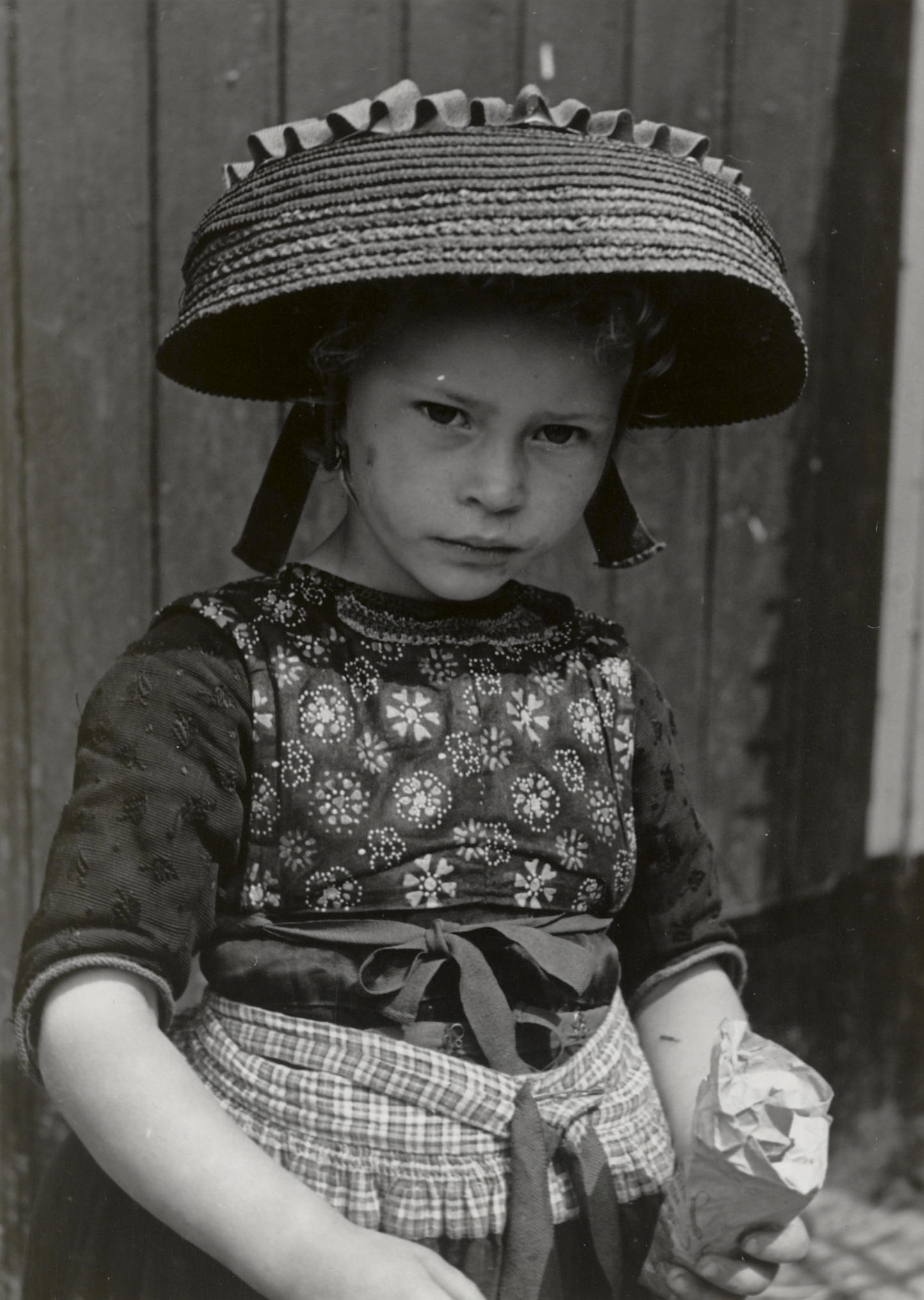 Aaltje Kooiker in Staphorster streekdracht. Speciaal voor de foto heeft ze over haar daagse muts een strohoed opgezet, de 'flapper'. Deze strohoeden werden door vrouwen en meisjes gedragen tijdens de oogst, als bescherming tegen de zon.