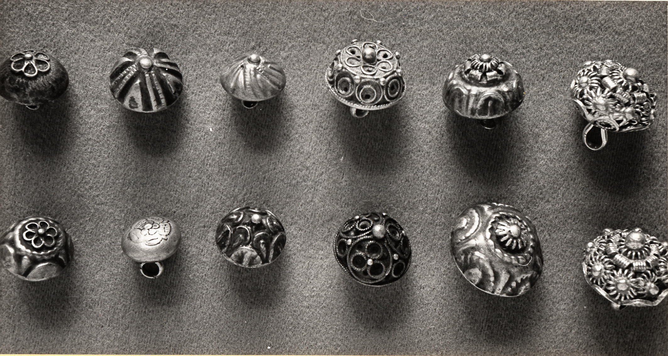 Verschillende soorten knopen in de werkplaats van A.J. Drost-Keus, weduwe van zilversmid A.O. Drost in Staphorst.