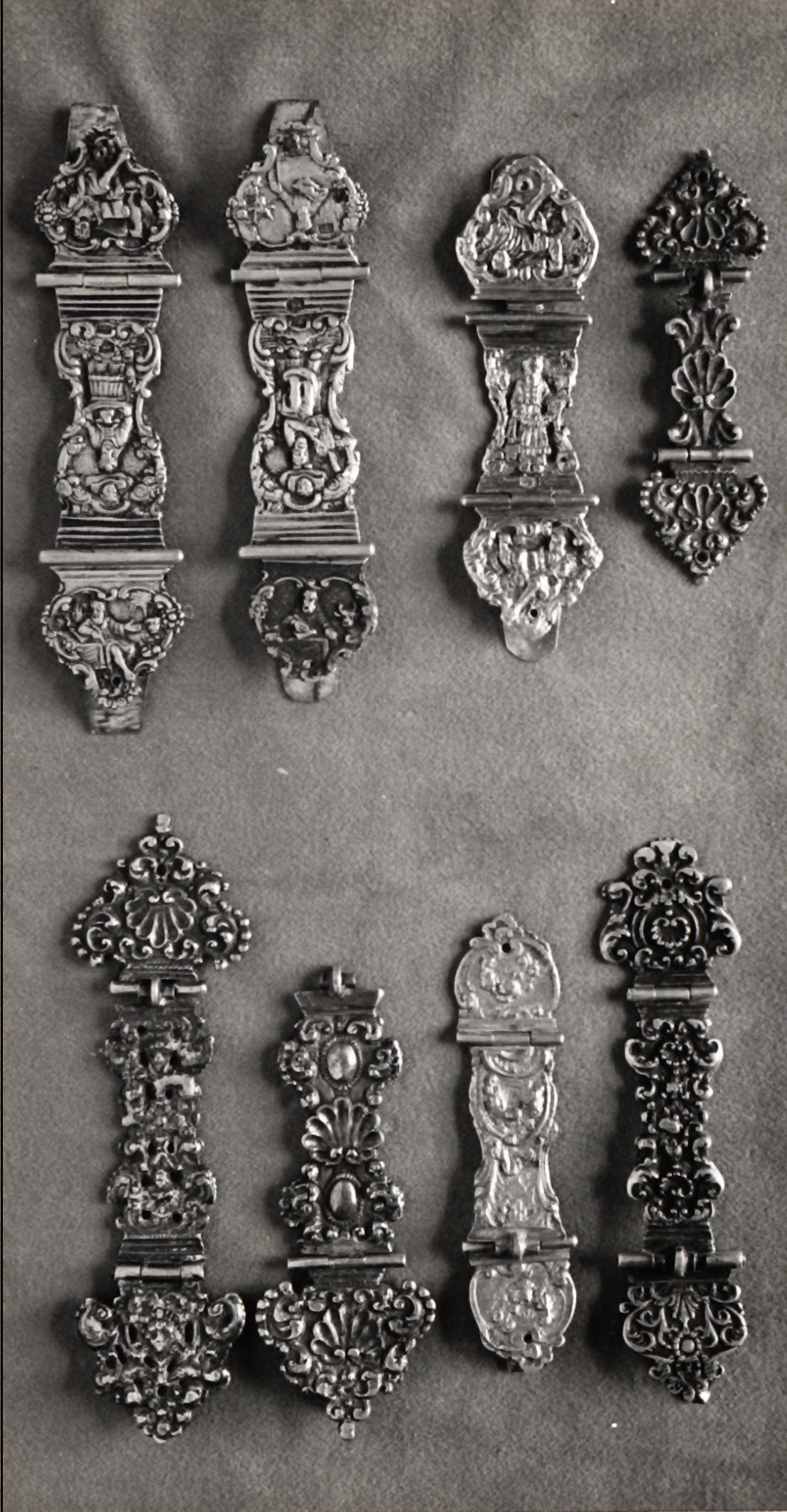 Acht soorten zilveren kerkboeksluitingen in de werkplaats van A.J. Drost-Keus, weduwe van zilversmid A.O. Drost in Staphorst. Niet ieder type is algemeen in Staphorst gebruikt.