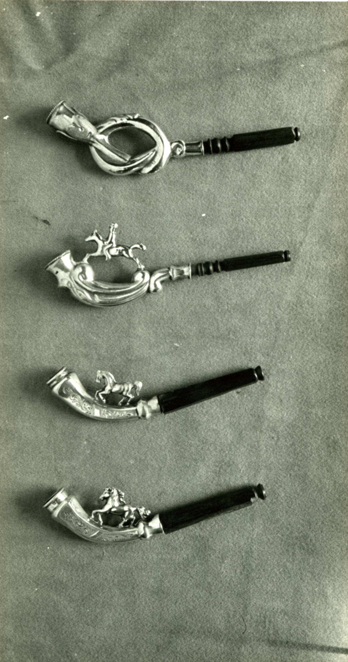 Vier zilveren sigarenpijpjes, waarvan drie met een paardje, in de werkplaats van A.J. Drost-Keus, weduwe van zilversmid A.O. Drost in Staphorst.