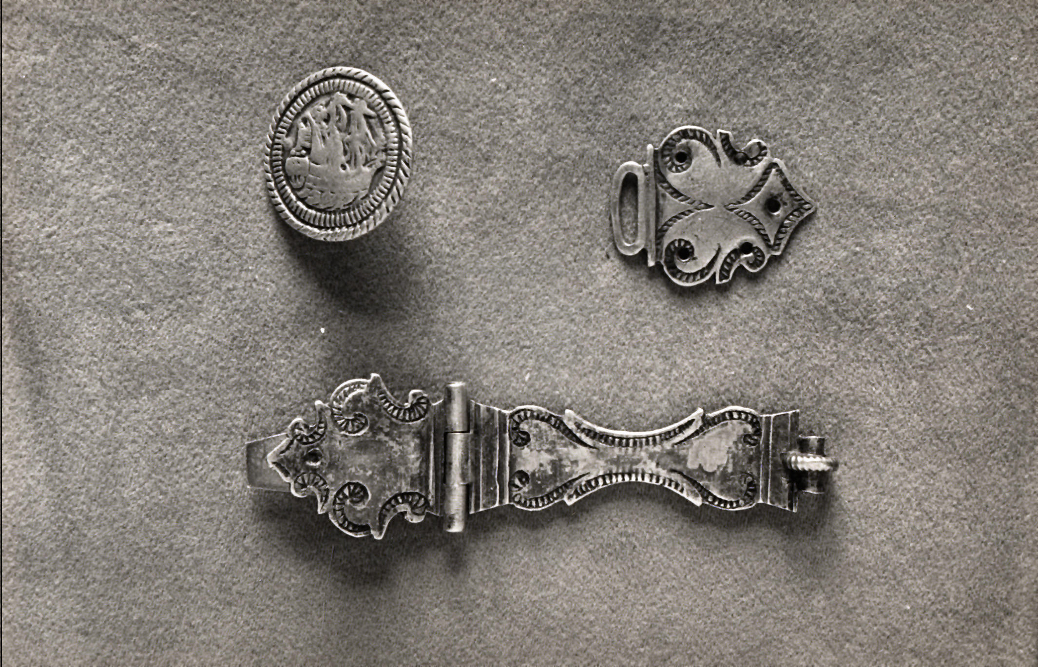 Zilveren broeksknoop met een afbeelding van een schip ('scheepjesschelling'), een zilveren oog en een gedeelte van een zilveren klamp, gebruikt als kerkboeksluiting, in de werkplaats van A.J. Drost-Keus, weduwe van zilversmid A.O. Drost in Staphorst. Dit type oog en dit type boekbeslag was niet algemeen in Staphorst in gebruik.
