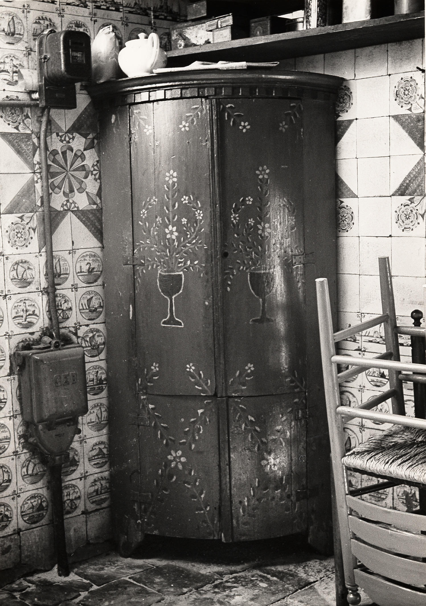 Beschilderde hoekkast, Staphorst, 1950 (zwart-wit foto)