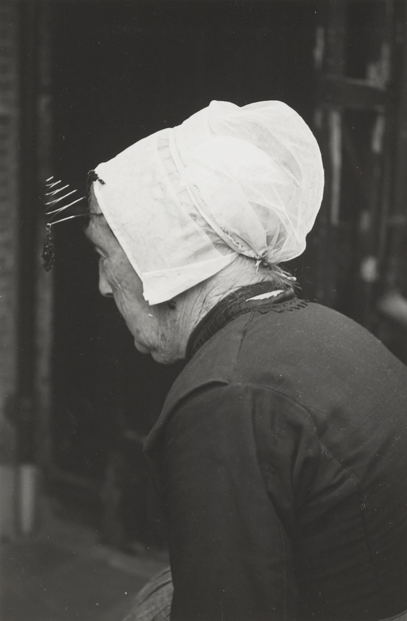 Maria van der Zwan-Moerman in Vlaardingse streekdracht. Maria is gekleed in zondagse rouwdracht. Ze draagt een schootjak met lange schoot, een rok en een schort zonder 'gatbanden'. Op haar hoofd heeft ze een zwarte ondermuts, een zilveren oorijzer met gouden krullen aan de uiteinden en daarover de 'oorijzermuts' van batist. Aan de krullen hangen oorijzerhangers. ...