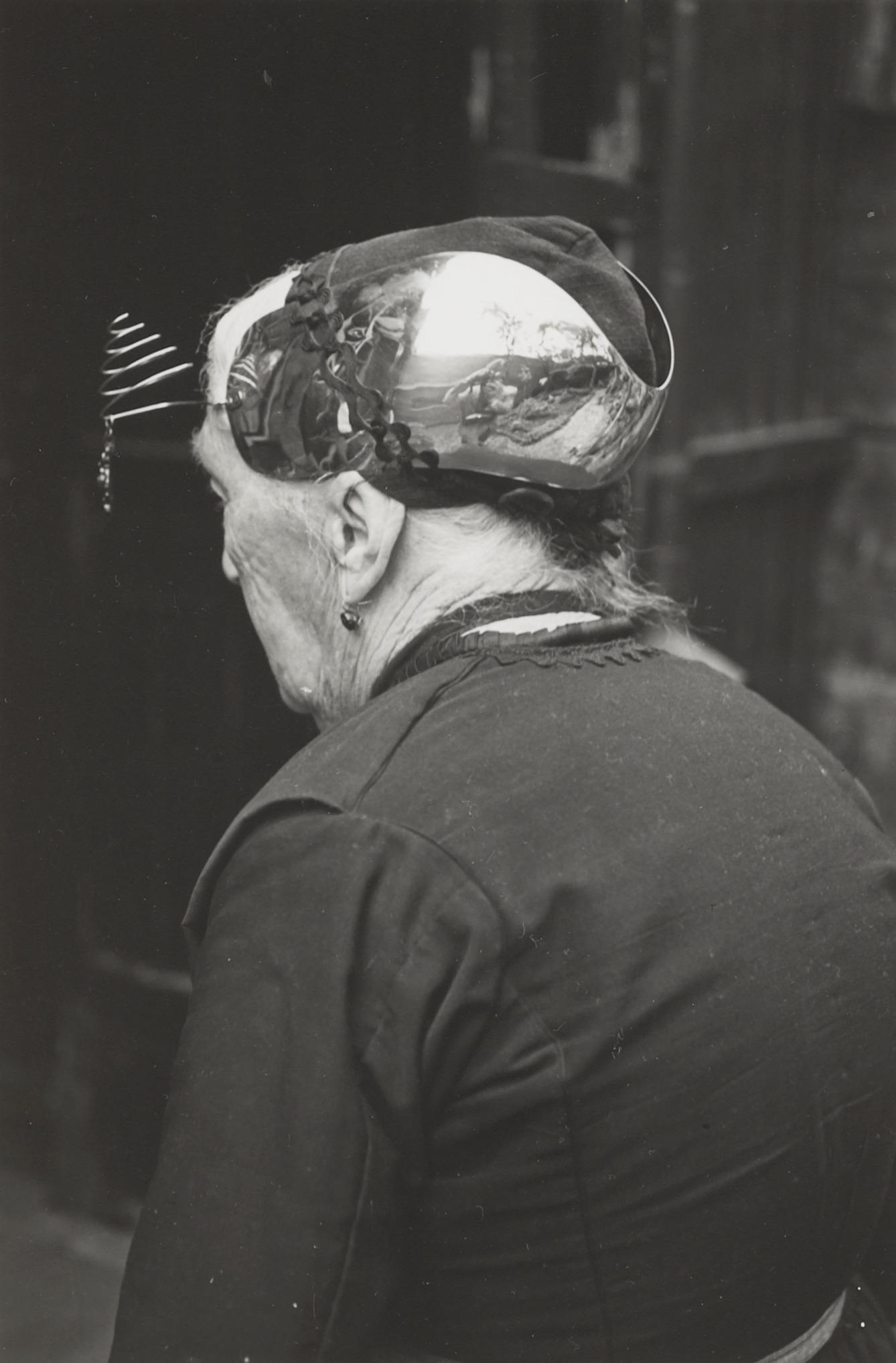 Maria van der Zwan-Moerman in Vlaardingse streekdracht. Ze draagt op haar hoofd een zwarte ondermuts en een zilveren oorijzer met gouden krullen aan de uiteinden. Aan de krullen hangen oorijzerhangers. Het oorijzer wordt op zijn plaats gehouden door een zwart bandje.