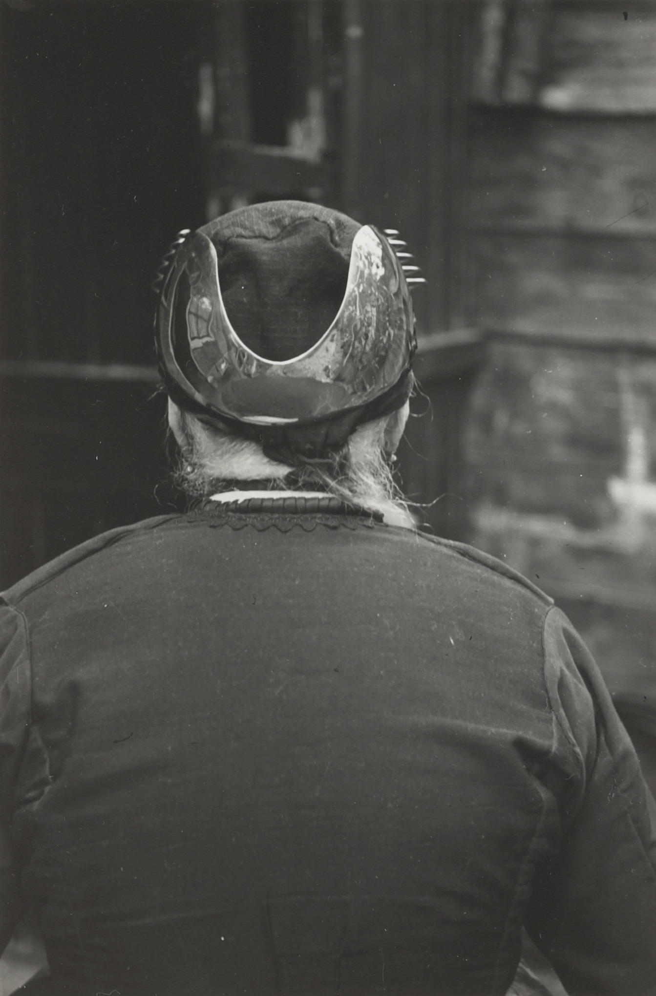 Maria van der Zwan-Moerman in Vlaardingse streekdracht. Ze draagt op haar hoofd een zwarte ondermuts en een zilveren oorijzer met gouden krullen aan de uiteinden. Aan de krullen hangen oorijzerhangers. Het oorijzer wordt op zijn plaats gehouden door een zwart bandje.