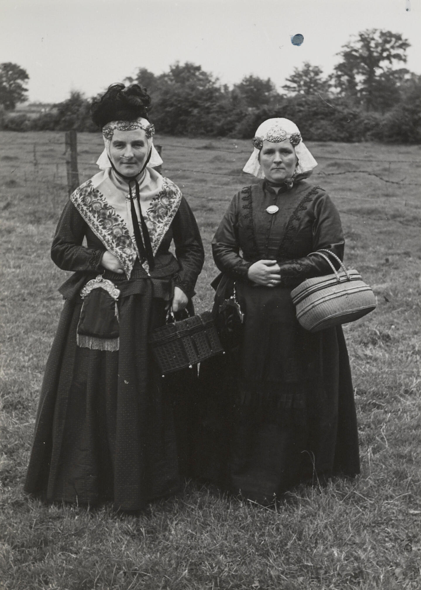 Twee vrouwen, verkleed in de streekdracht van Oost-Drenthe, 1950 (zwart-wit foto)