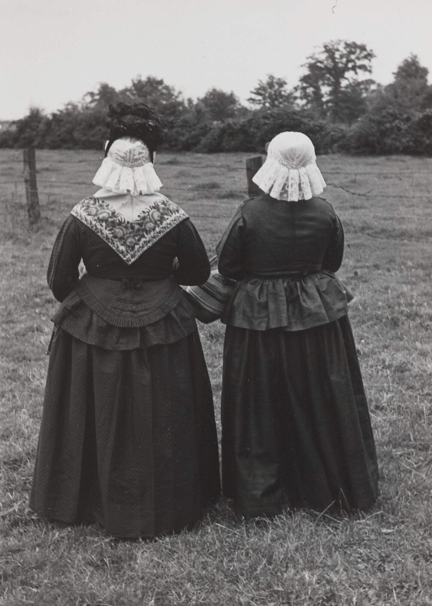 Twee vrouwen, verkleed in de streekdracht van Oost-Drenthe, 1950 (zwart-wit foto)