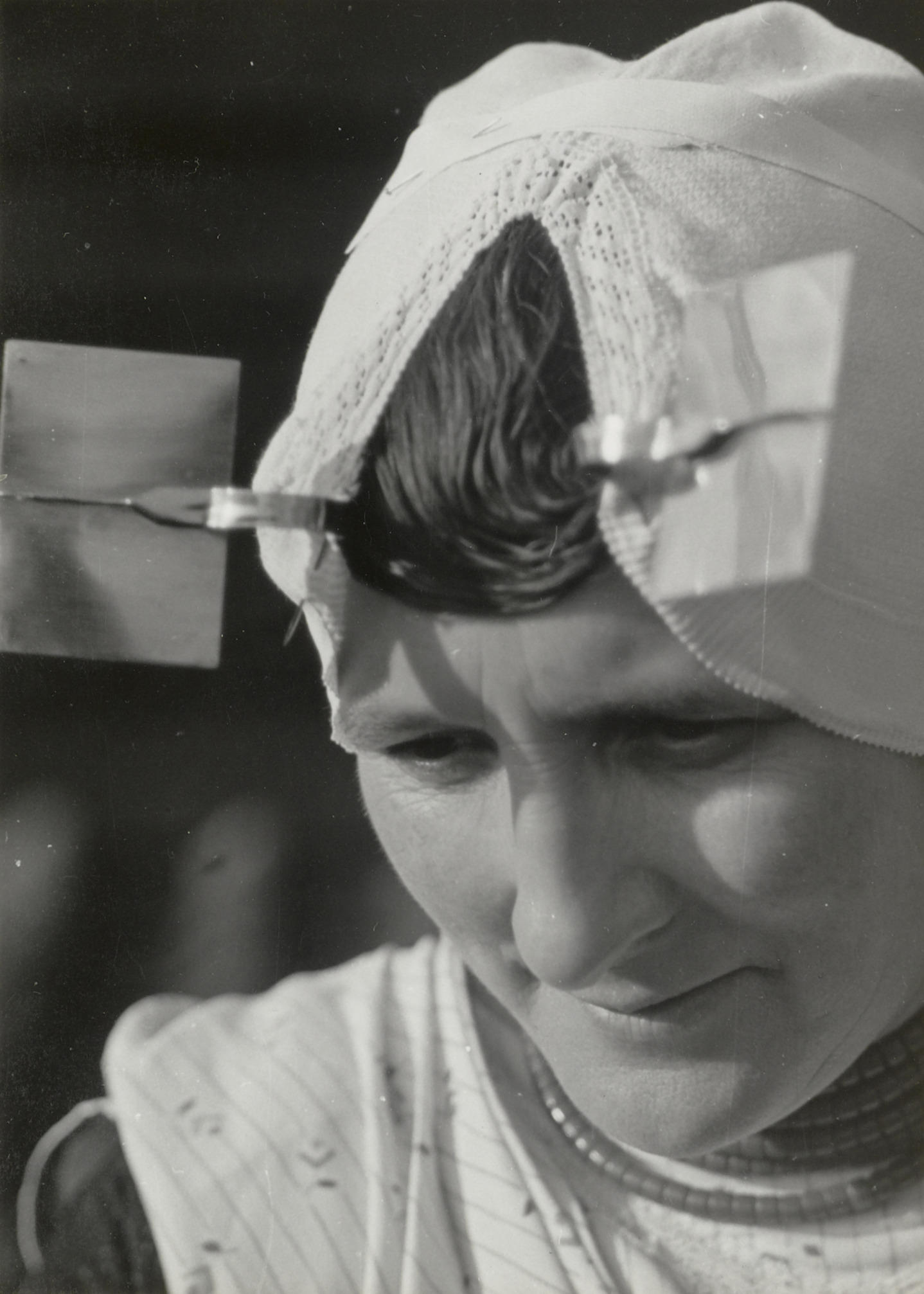 Vrouw in katholieke Zuid-Bevelandse dracht, Heinkenszand, 1950 (zwart-wit foto)