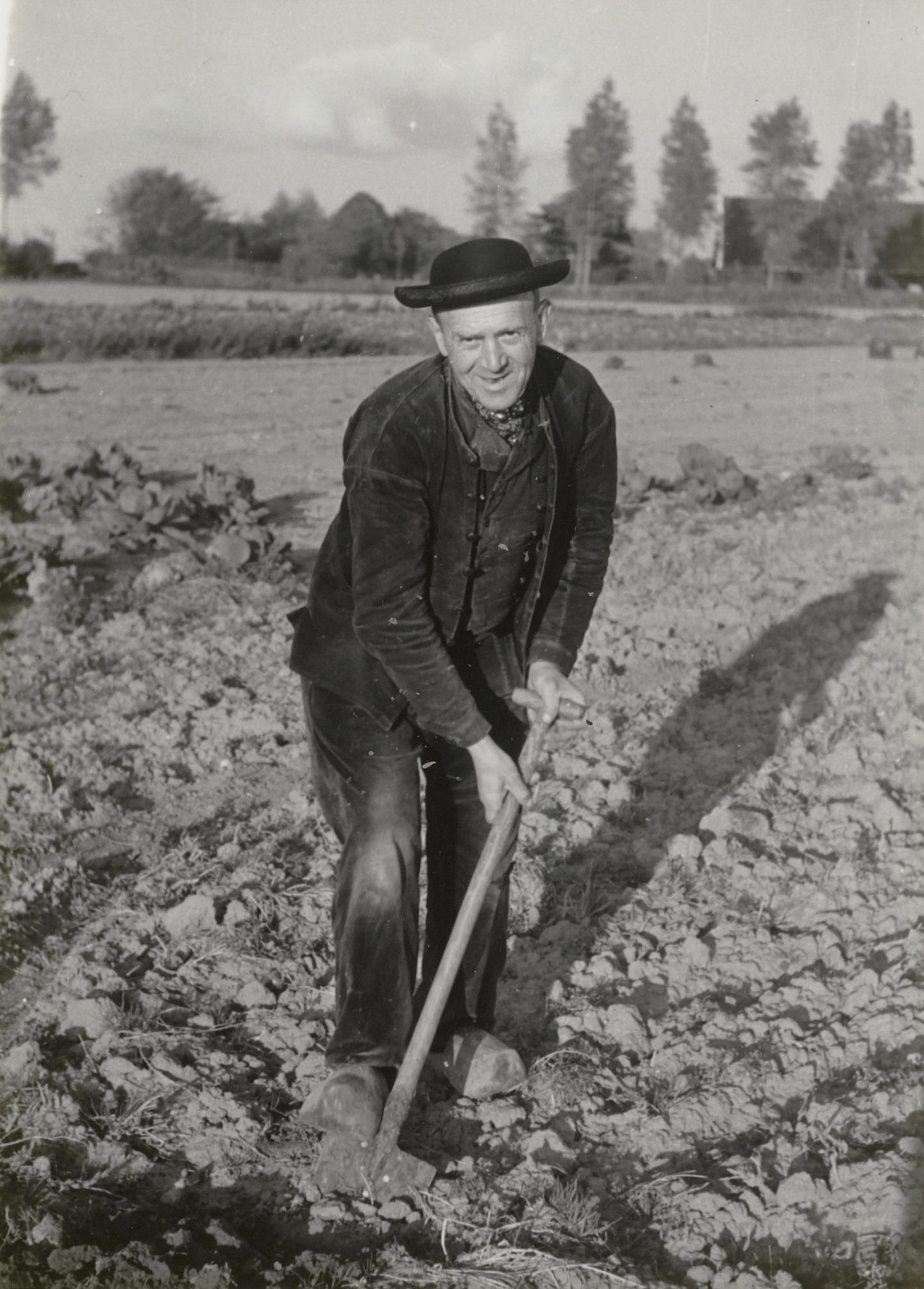 Man uit Ovezande in katholieke Zuid-Bevelandse streekdracht. De man is gekleed in werkdracht. Hij is aan het spitten op een akker. Hij draagt een zogenoemde knoprok (jas). Een knoprok werd doorgaans gemaakt van bombazijn, een stevige geruwde katoenen stof, en uitsluitend doordeweeks gedragen.