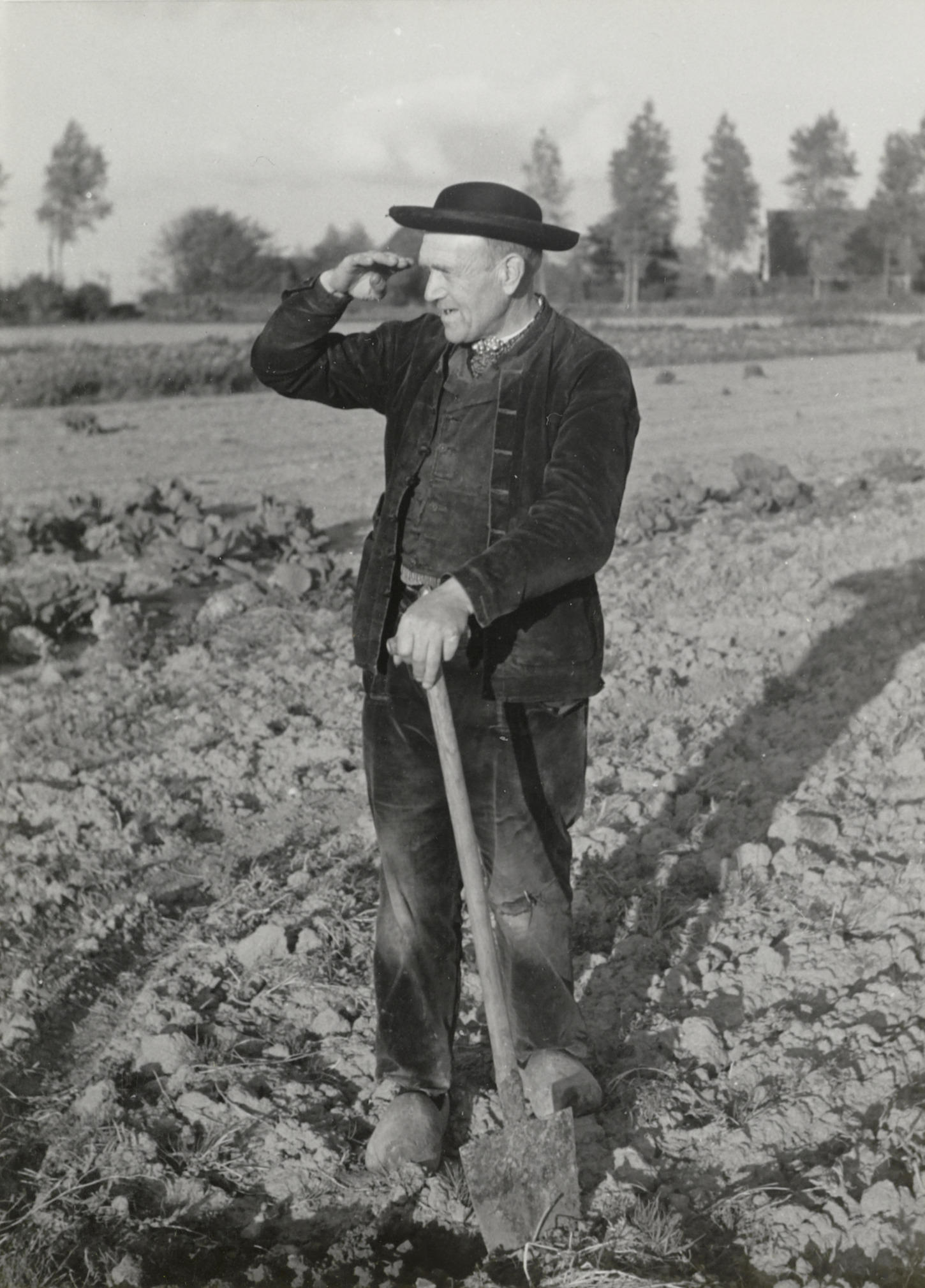 Man uit Ovezande in katholieke Zuid-Bevelandse streekdracht. De man is gekleed in werkdracht. Hij is aan het spitten op een akker. Hij draagt een zogenoemde knoprok (jas). Een knoprok werd doorgaans gemaakt van bombazijn, een stevige geruwde katoenen stof, en uitsluitend doordeweeks gedragen.