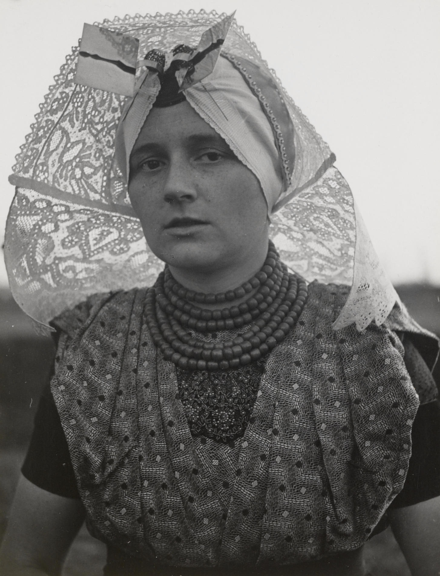 Vrouw in katholieke Zuid-Bevelandse dracht, Ovezande, 1950 (zwart-wit foto)
