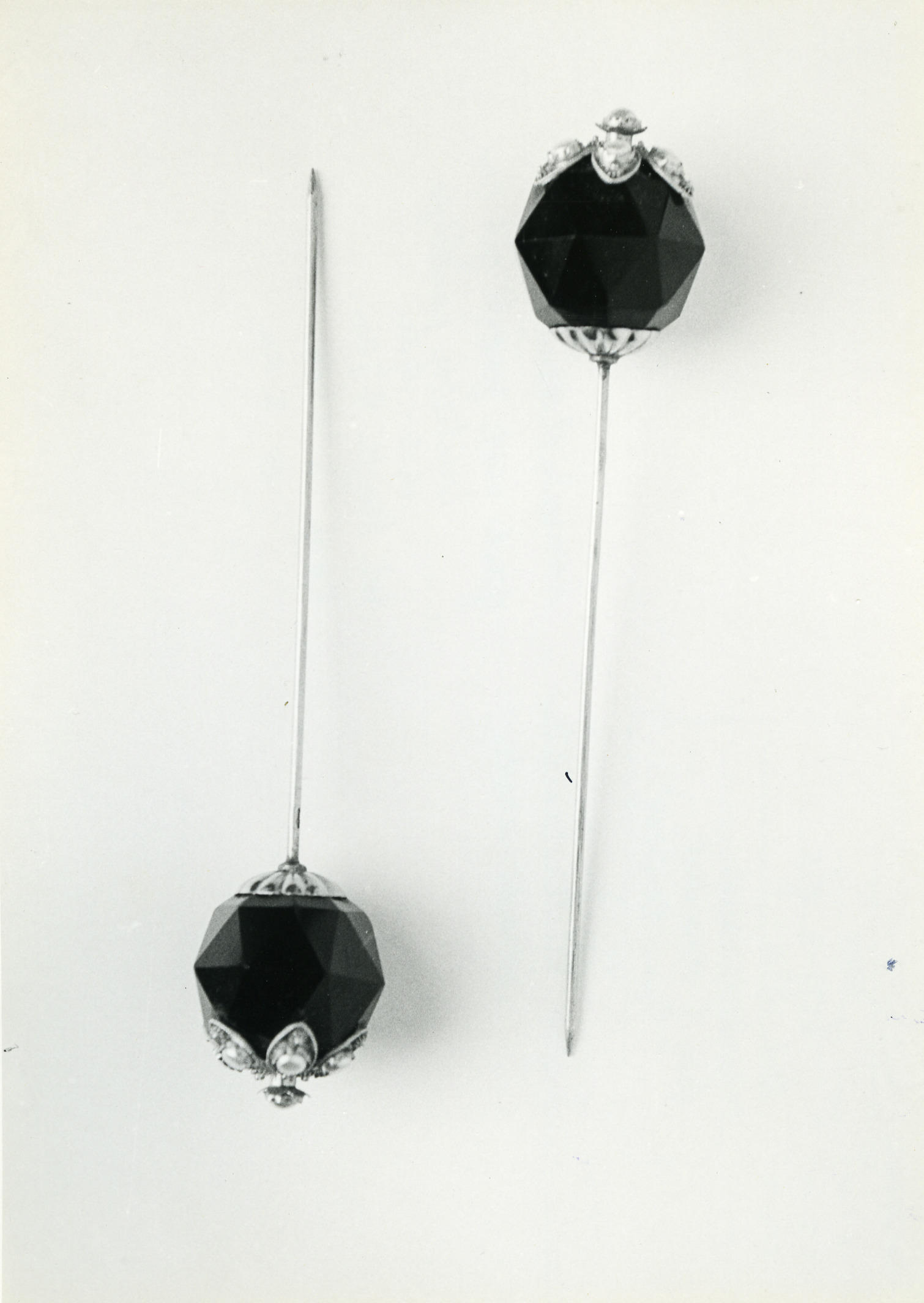 Paar rouwspelden van goud met een gefaceteerde zwarte knop en imitatiepareltjes. De spelden zijn gedragen in Heinkenszand bij de Zuid-Bevelandse streekdracht in de rouw en gemaakt rond 1915-1920. Ze zijn eigendom van een familie in Heinkenszand.