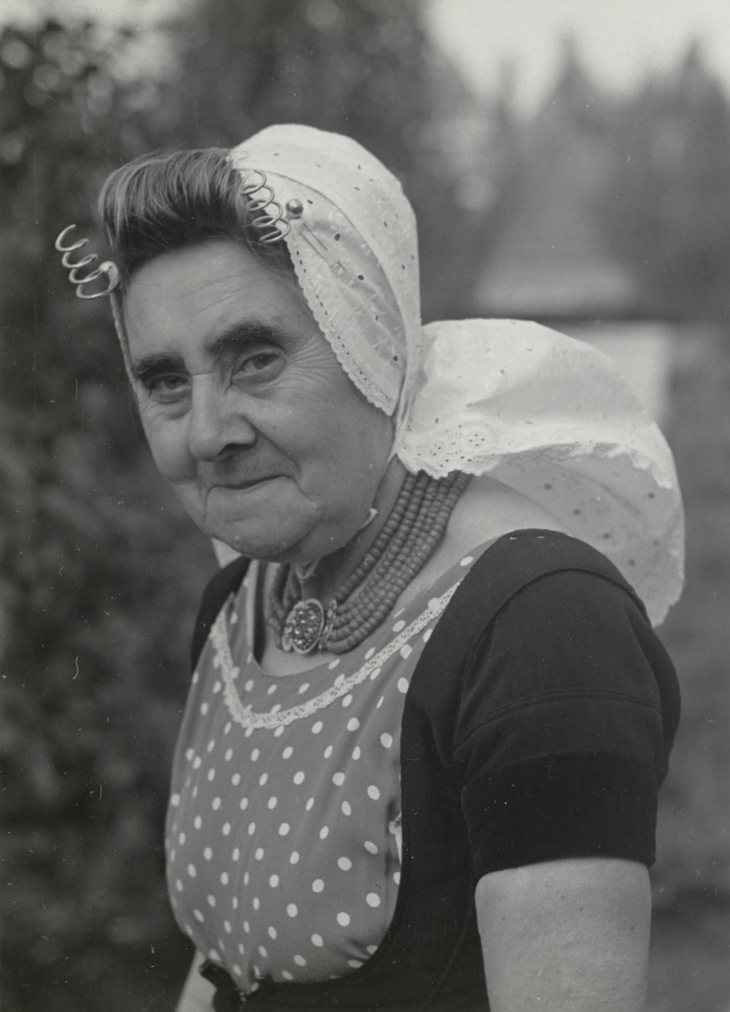 Vrouw uit Veere in Walcherse dracht, 1950 (zwart-wit foto)