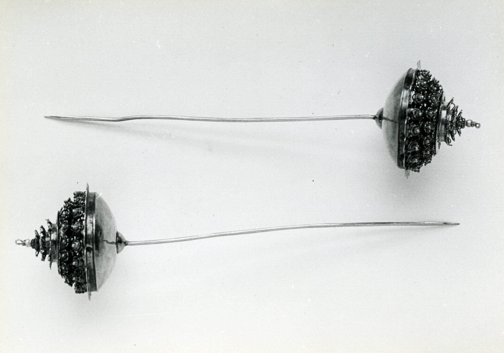 Paar mutsspelden, zogenoemde torenspelden, met gouden knoppen met filigreinwerk en parels en zilveren steekspelden. De mutsspelden zijn gedragen door een vrouw in streekdracht uit Arnemuiden. Ze zijn eigendom van een familie in Arnemuiden.