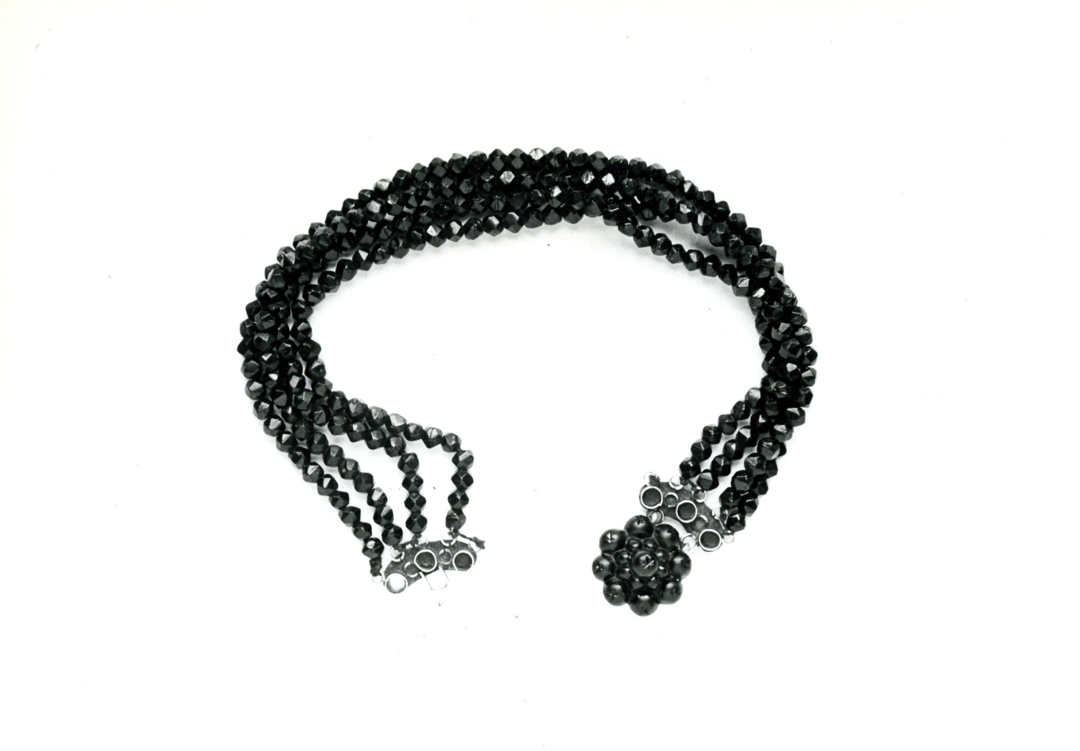 Halssnoer, bestaande uit een zilveren slot met vier strengen zwarte kralen. Het halssnoer is gemaakt in 1944 en gedragen bij de rouwdracht door een vrouw in streekdracht uit Arnemuiden. Het is eigendom van een familie in Arnemuiden.