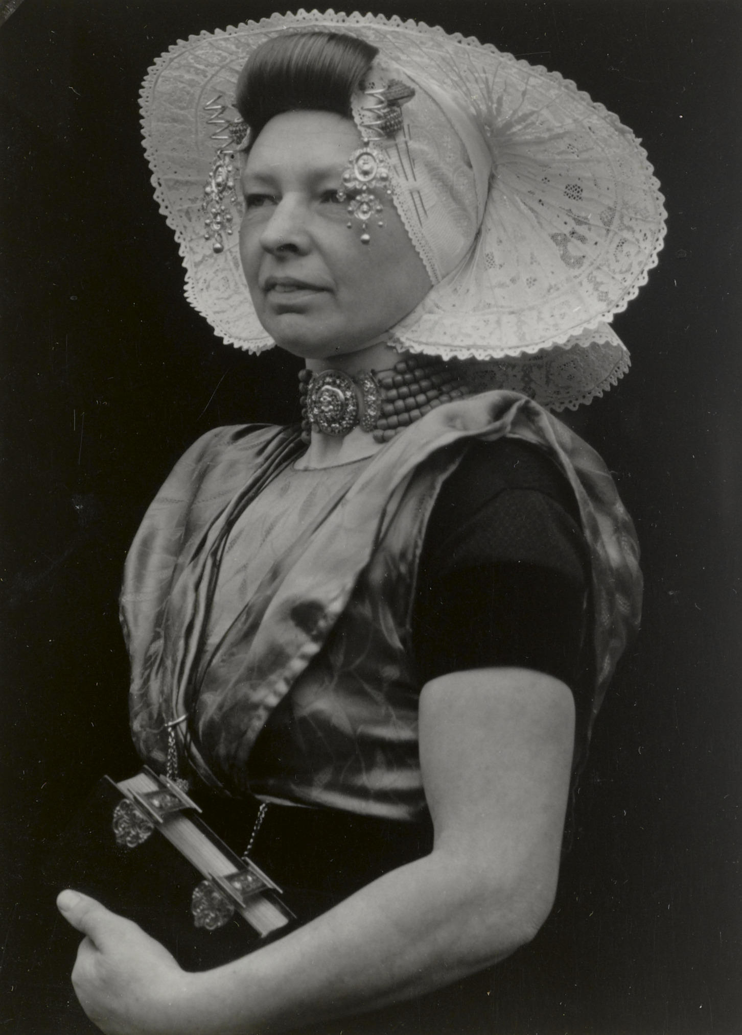 Elizabeth Baas in Nieuwlandse dracht, 1950 (zwart-wit foto)